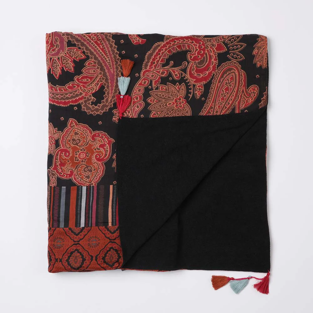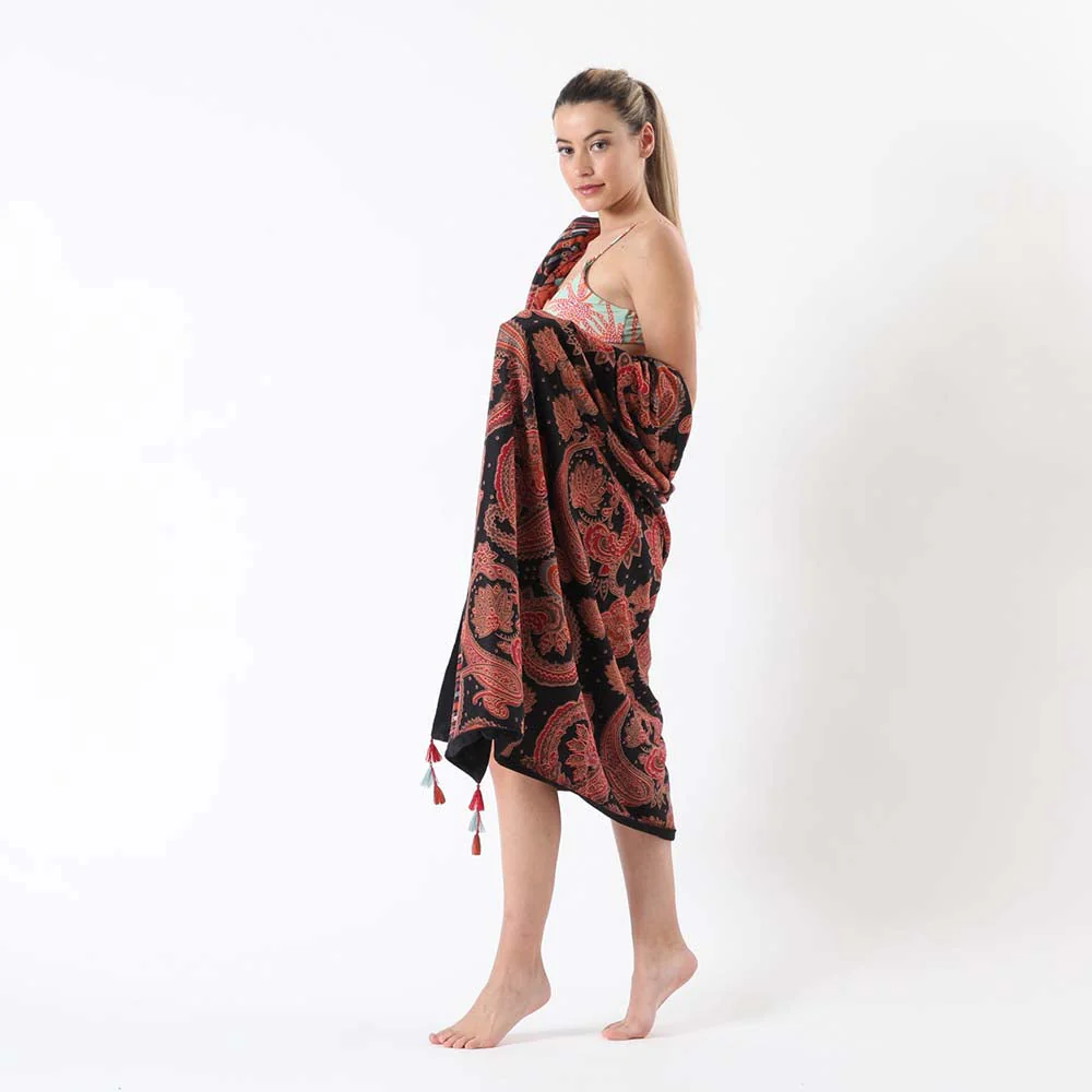 Toalla Humana Boho de color negro. Este producto es una toalla reversible que combina dos materiales, por un lado algodón con estampados de motivos rococó boho en tonos negro, rojo, naranjo y celeste, y por el revés es de toalla negra.
