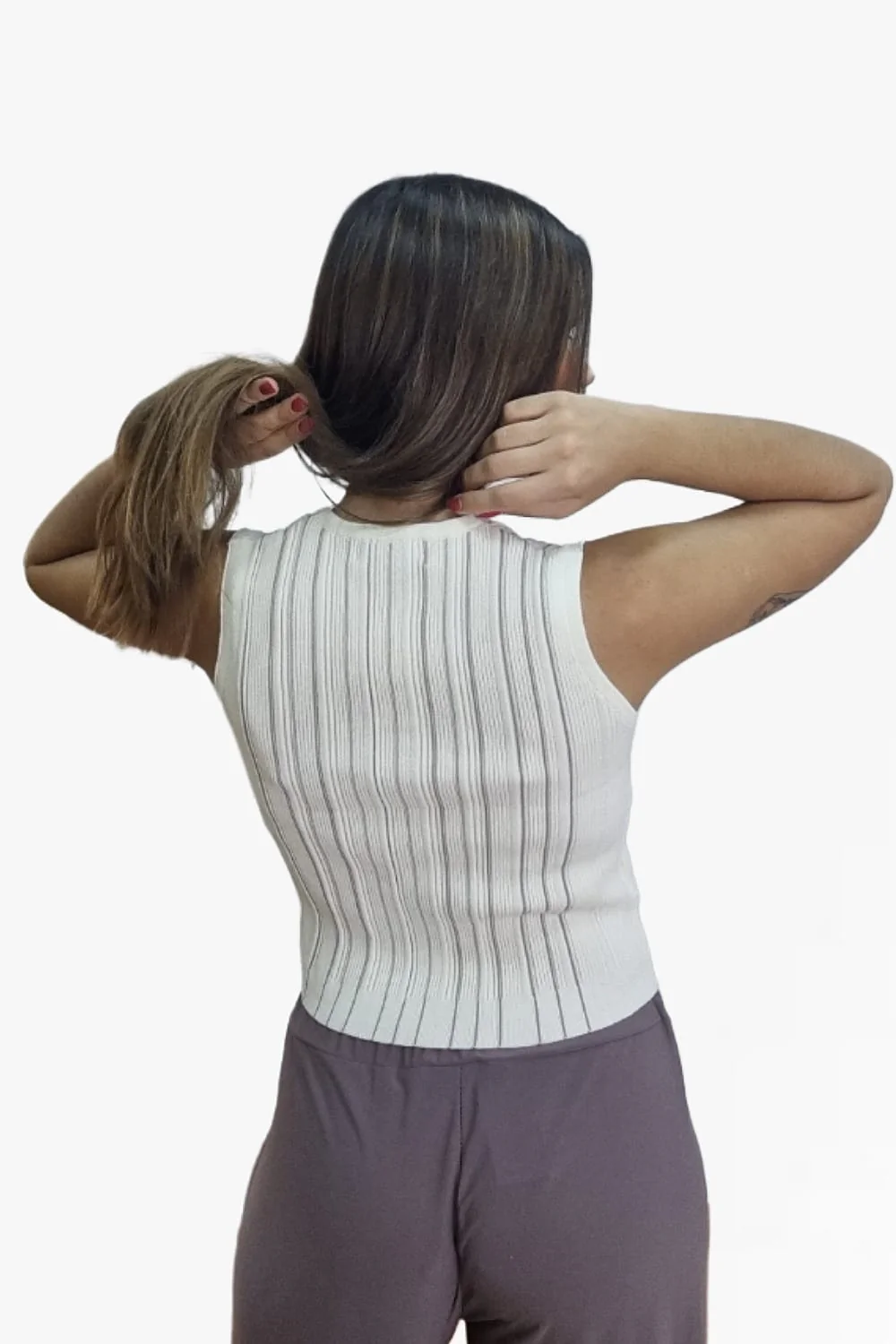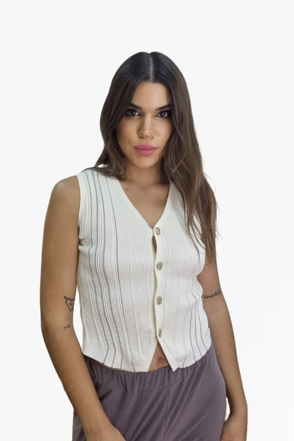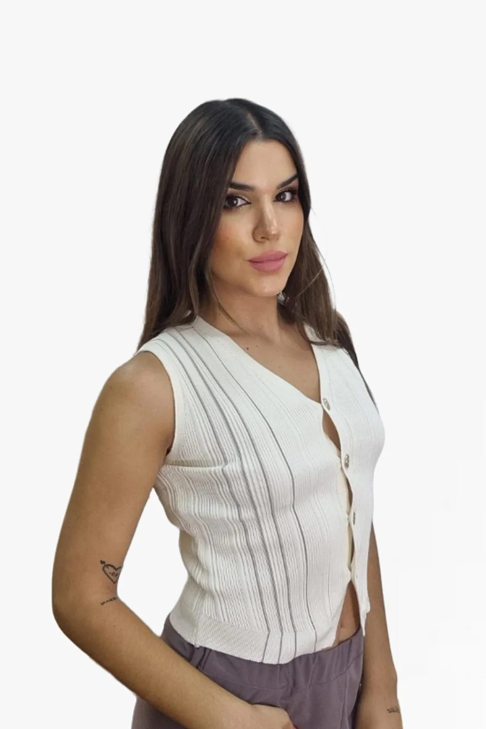 Top sin mangas, corte chaleco, decorado con lineas verticales y botones.