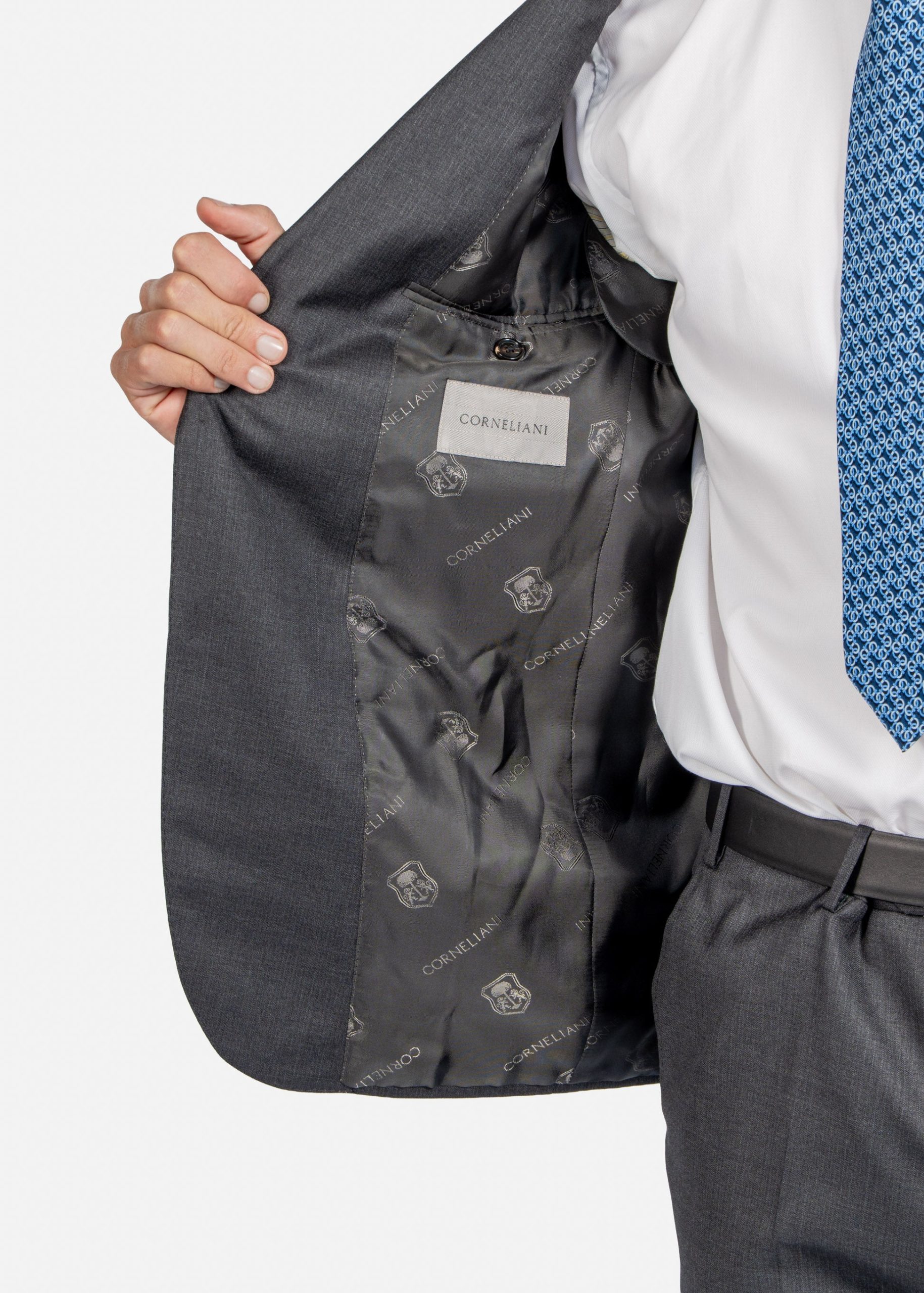Confeccionado en Italia con 100% lana virgen, este traje Corneliani gris antracita representa la excelencia en sastrería masculina. La chaqueta de dos botones presenta solapas de muesca, bolsillo ribeteado en el pecho y dos bolsillos con solapa, complementada por un pantalón de corte recto con pinzas. Cada detalle, desde los puños con botones hasta el cierre con cremallera y botón oculto del pantalón, refleja el compromiso con la calidad y elegancia que caracteriza a esta prestigiosa marca italiana.