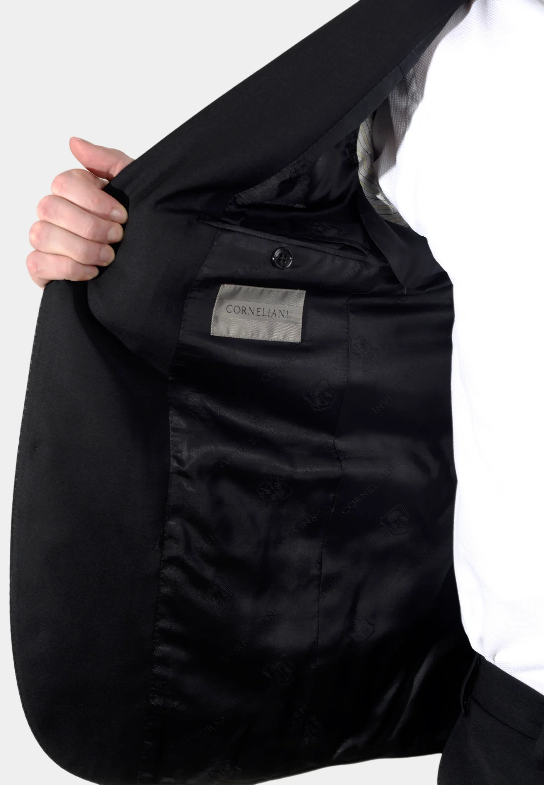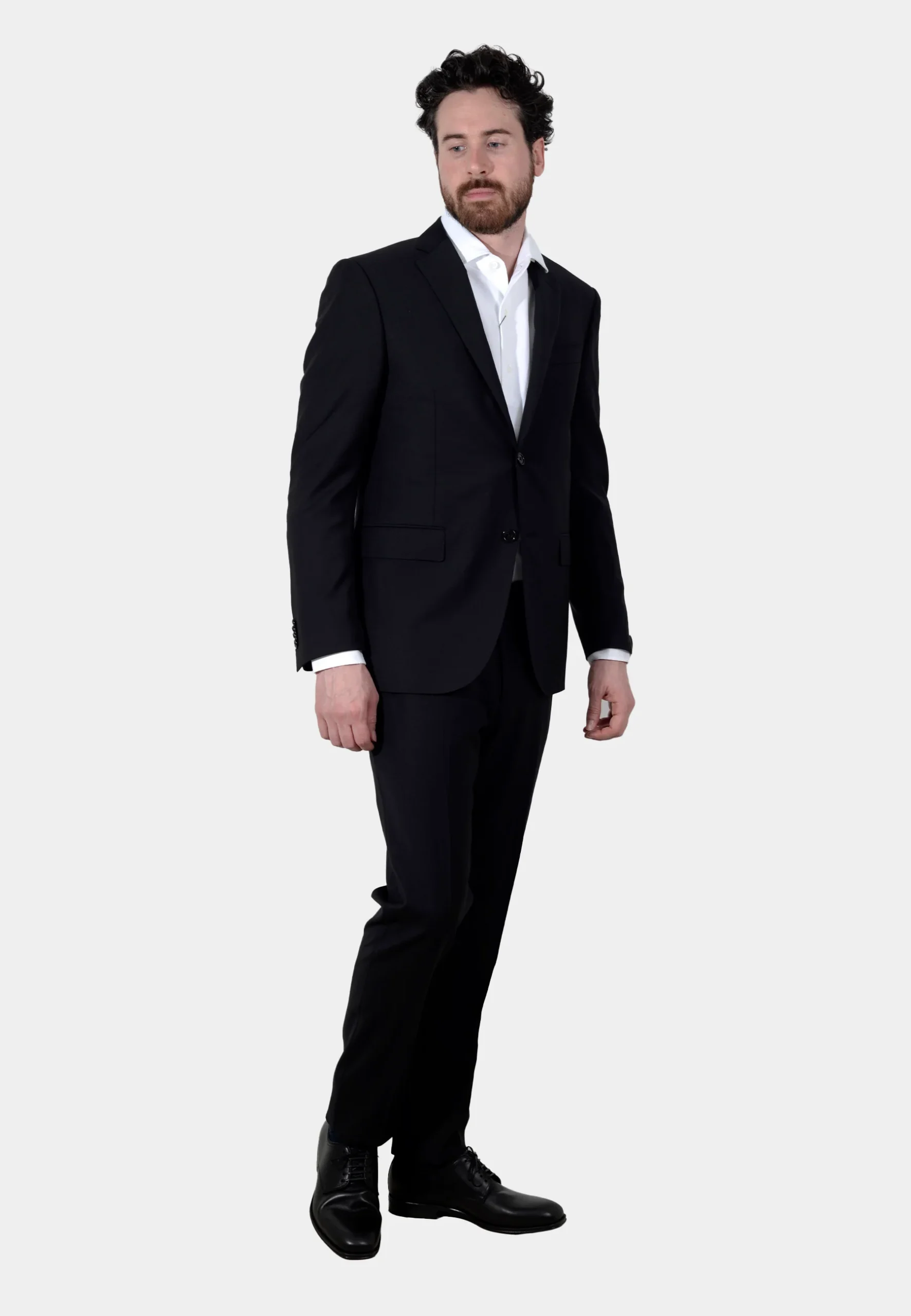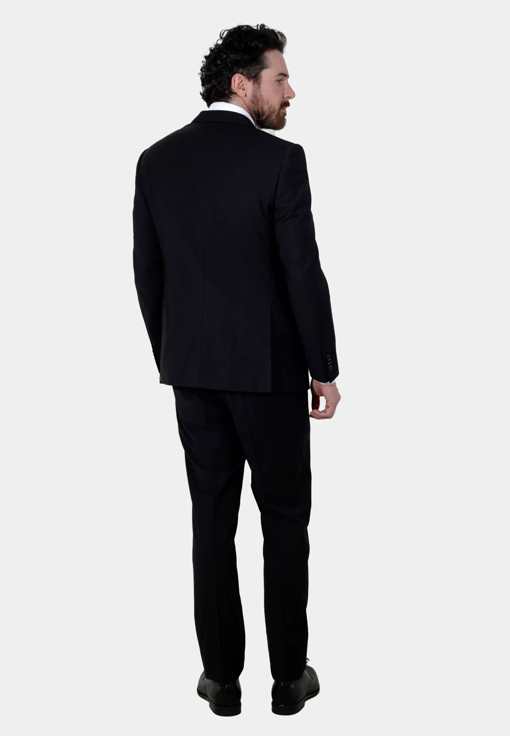 traje de dos piezas es la pieza central de cualquier guardarropa formal, combinando un estilo atemporal con un ajuste moderno. Confeccionado en un color negro profundo, es una elección versátil para eventos de gala, reuniones de negocios serias o ceremonias. Acabados de sastrería de calidad, incluyendo un forro interior liso (visible en la imagen) para un deslizamiento cómodo sobre la camisa. Un traje negro es la elección más segura y elegante, funcionando como un lienzo perfecto para corbatas de color o camisas texturizadas.
