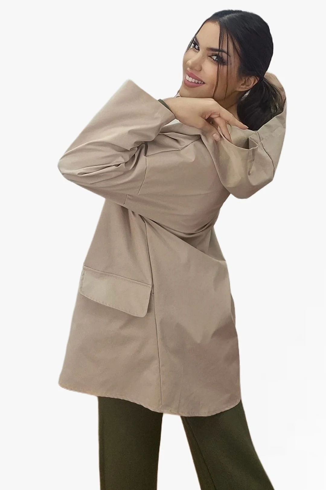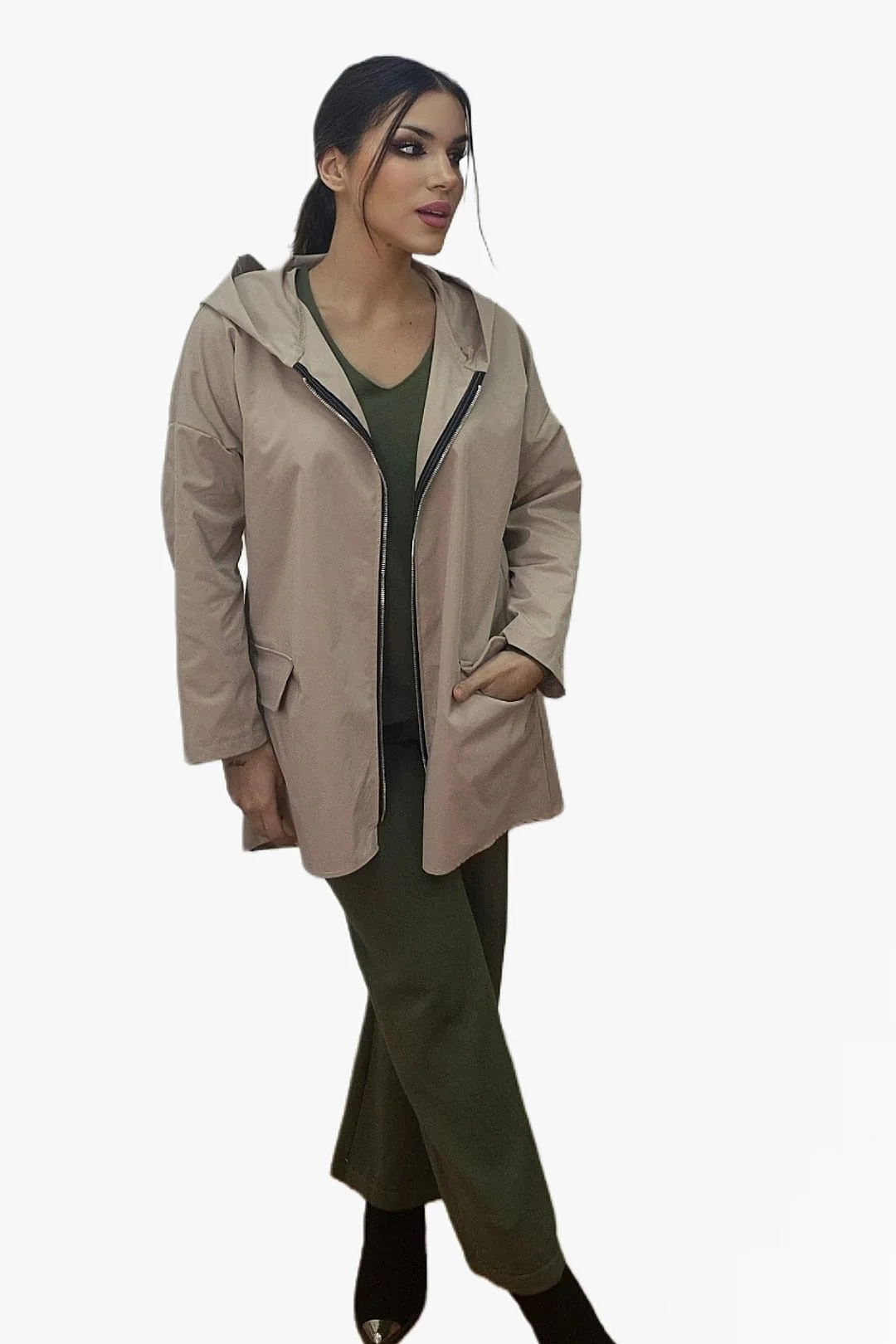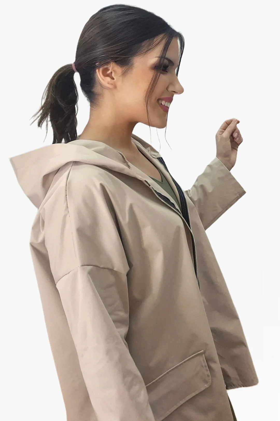 Chaqueta tipo trenca con corte irregular. Con capucha, cierre a cremallera y bolsillos