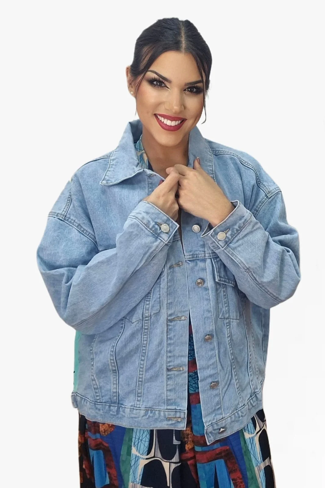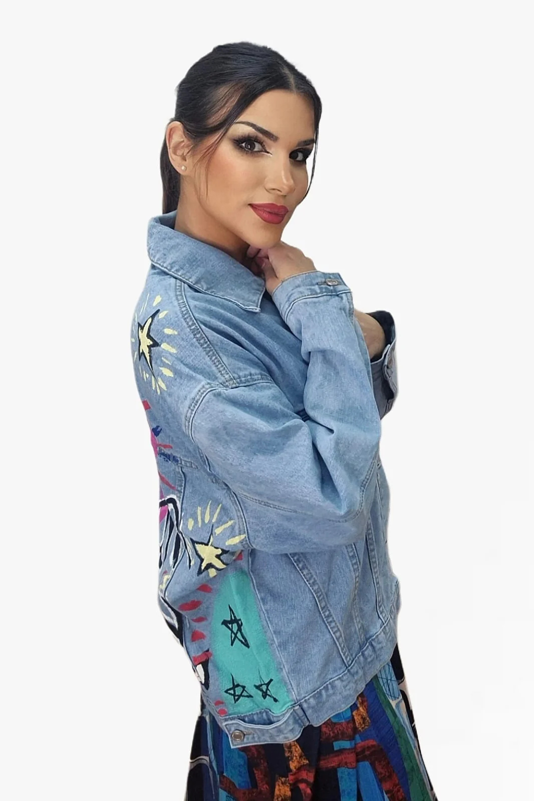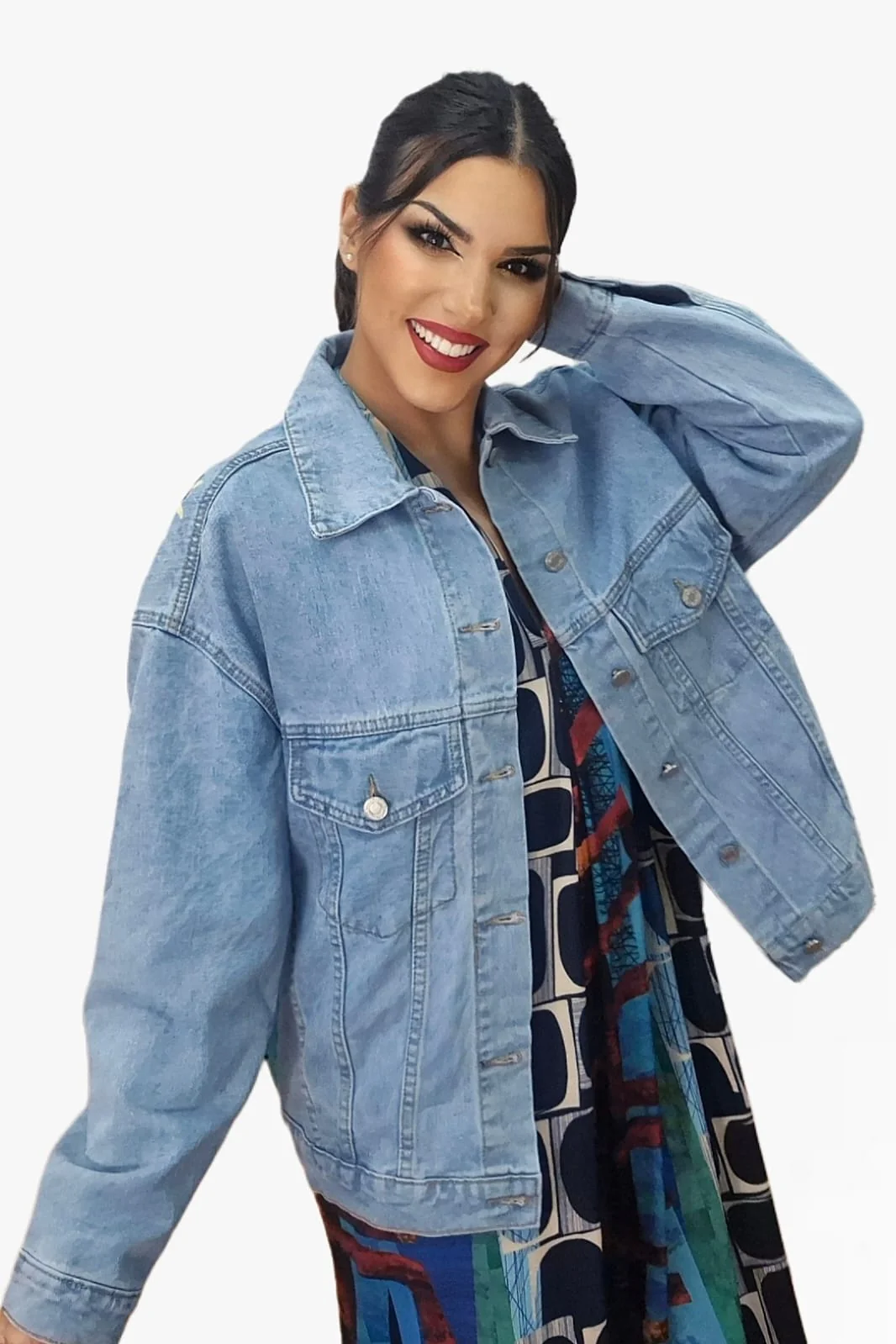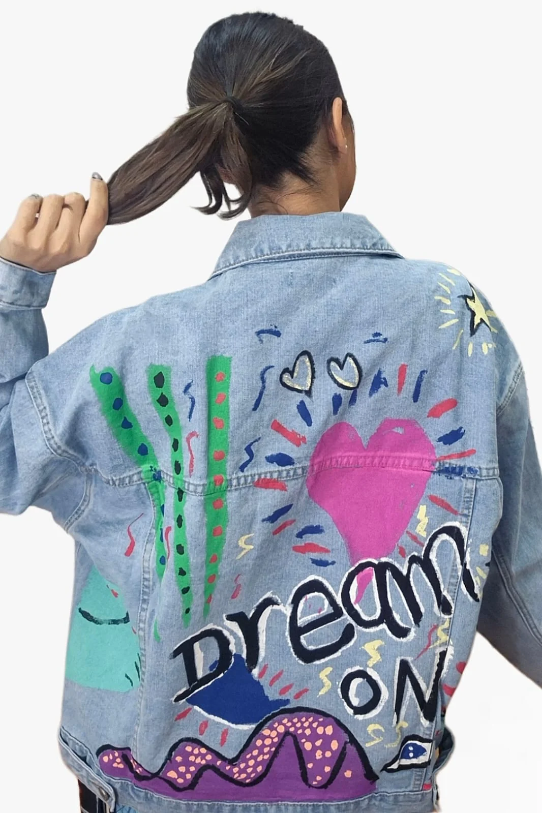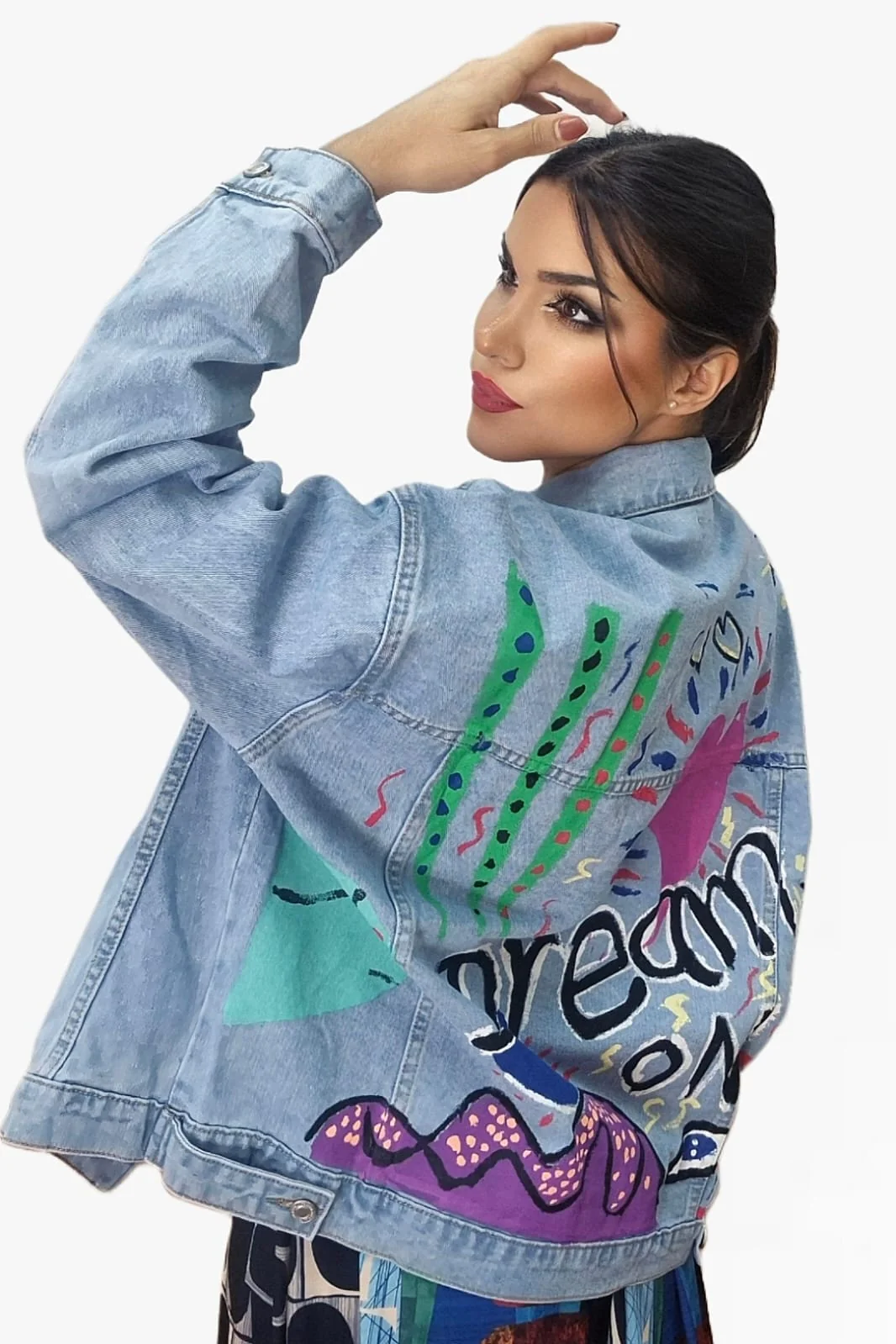 Despierta tu lado más creativo con esta chaqueta vaquera de diseño exclusivo y mensaje inspirador en la espalda. Con ilustraciones coloridas y la frase “Dream On”, es perfecta para destacar y aportar un toque artístico a cualquier look. Su corte oversize ofrece un estilo relajado y actual, ideal para combinar con vestidos, pantalones o faldas.