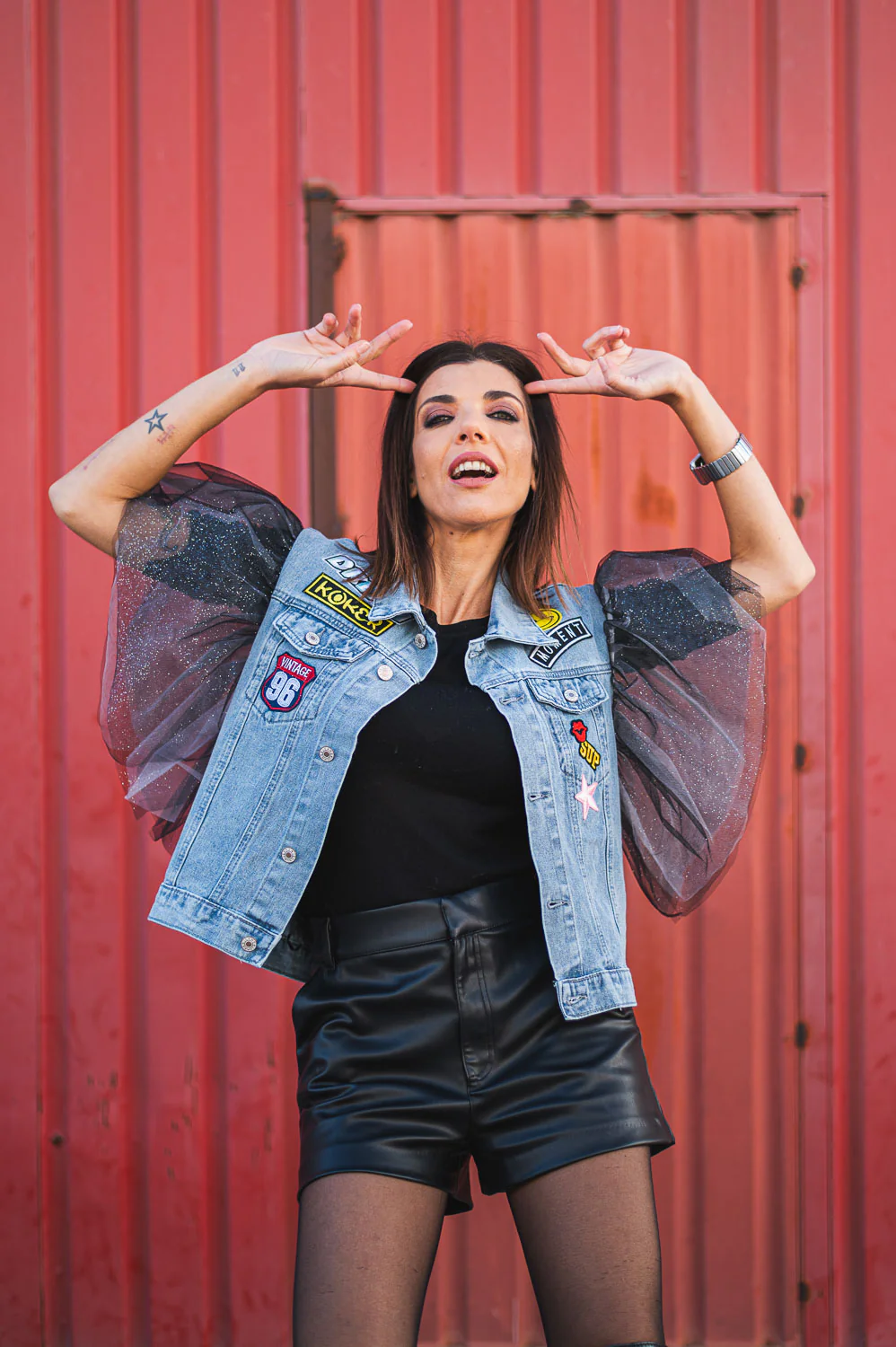 Chaqueta vaquera parcheada con mangas en forma de mariposa de organza y parche en parte trasera.