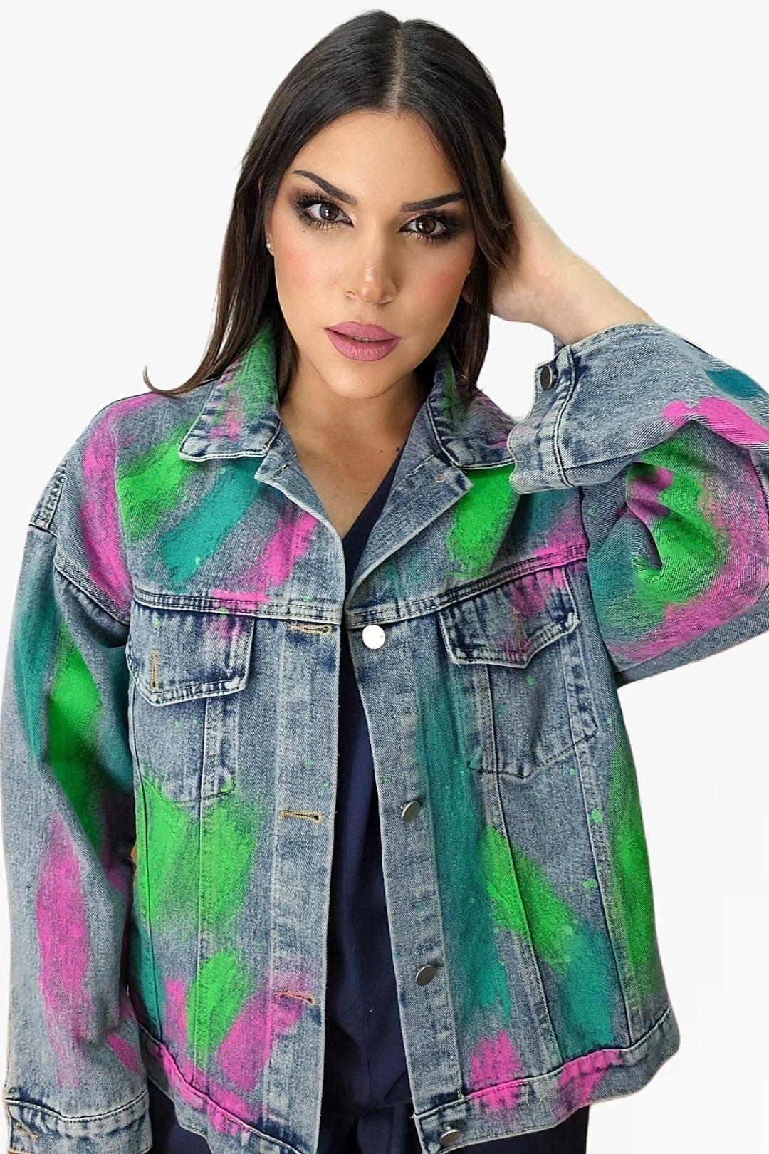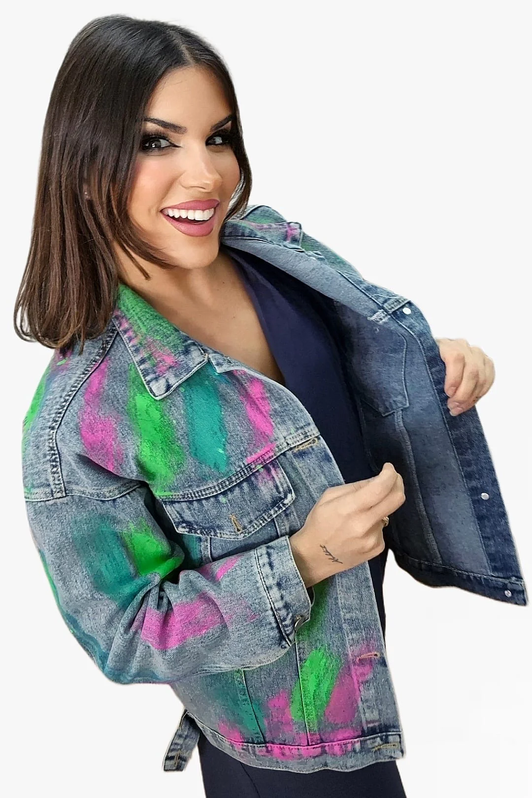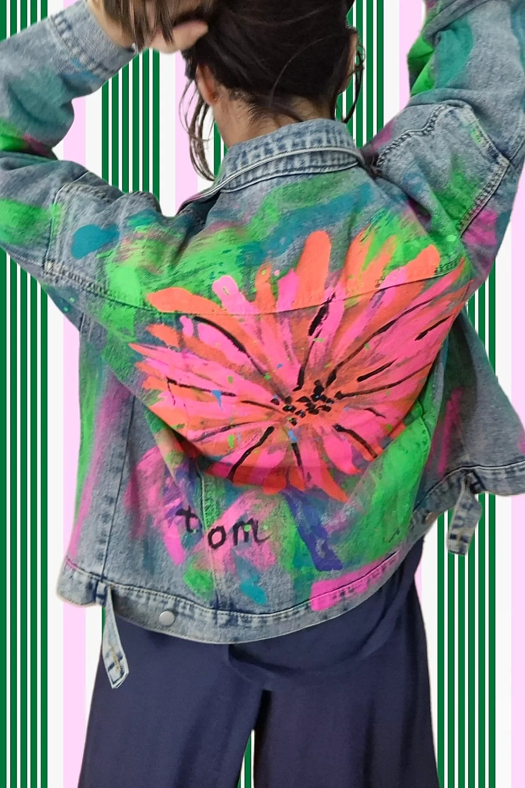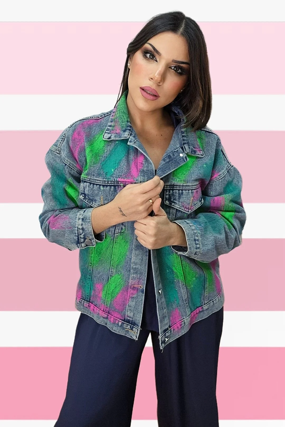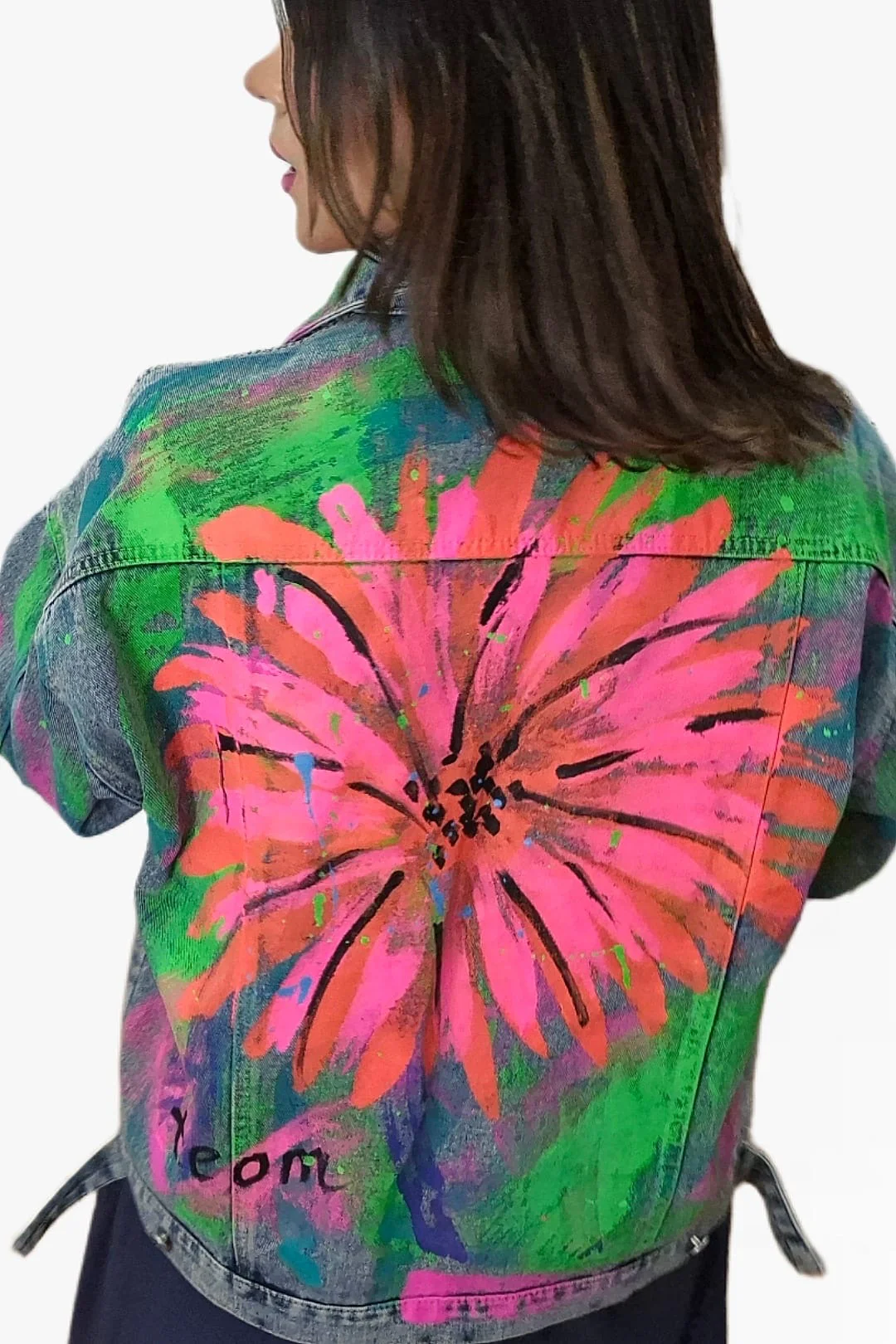 Dale un giro original a tu armario con esta chaqueta vaquera de diseño exclusivo. Confeccionada en una mezcla de 75% algodón y 25% poliéster, esta prenda combina comodidad y estilo con un toque artístico. Destacan sus vibrantes pinceladas en tonos fucsia, verde y azul, cuidadosamente aplicadas a mano, y una espectacular flor pintada en la espalda que convierte esta chaqueta en una pieza única.