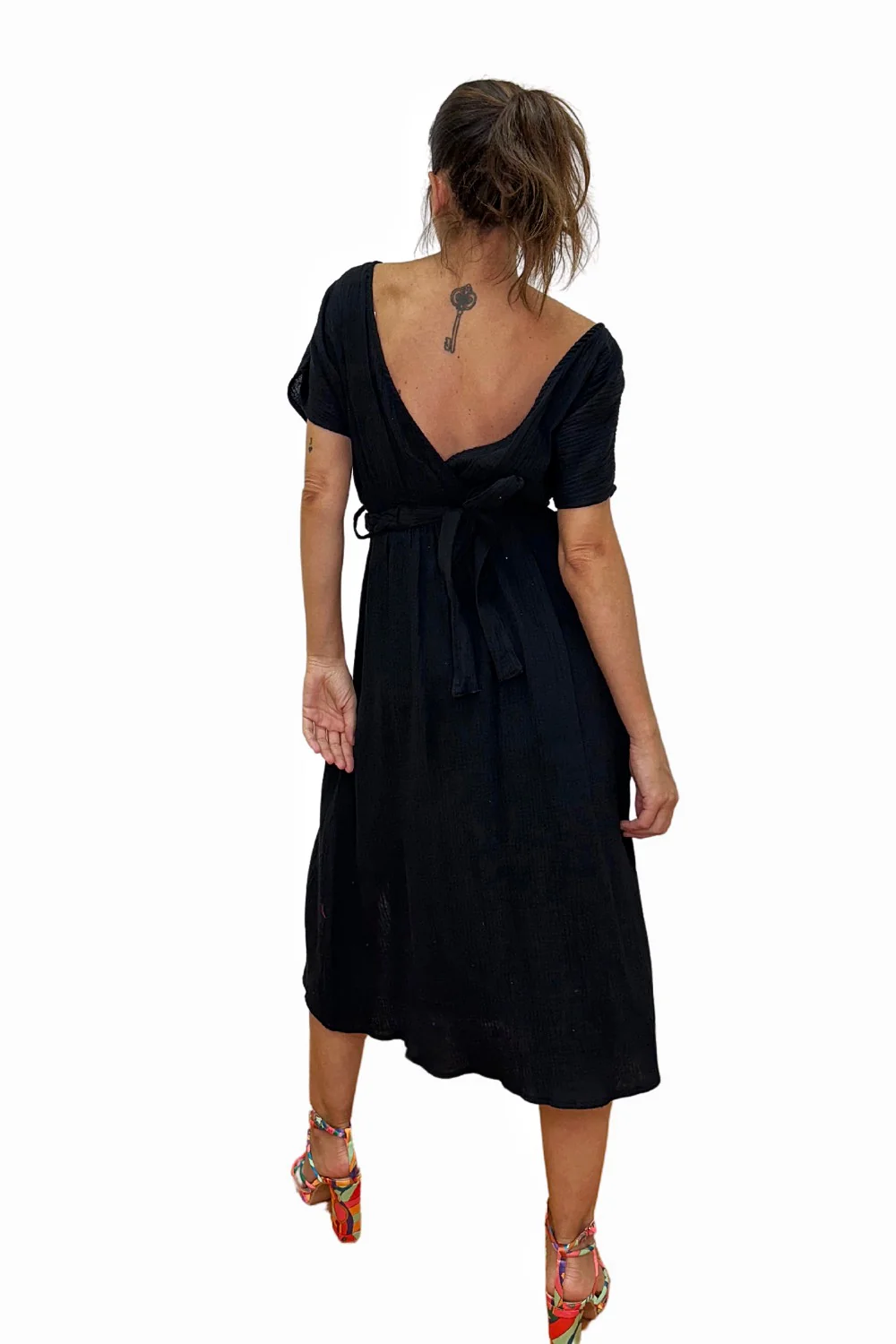 Vestido midi con escote cruzado, cinturón trenzado del mismo color y espalda abierta cruzada.