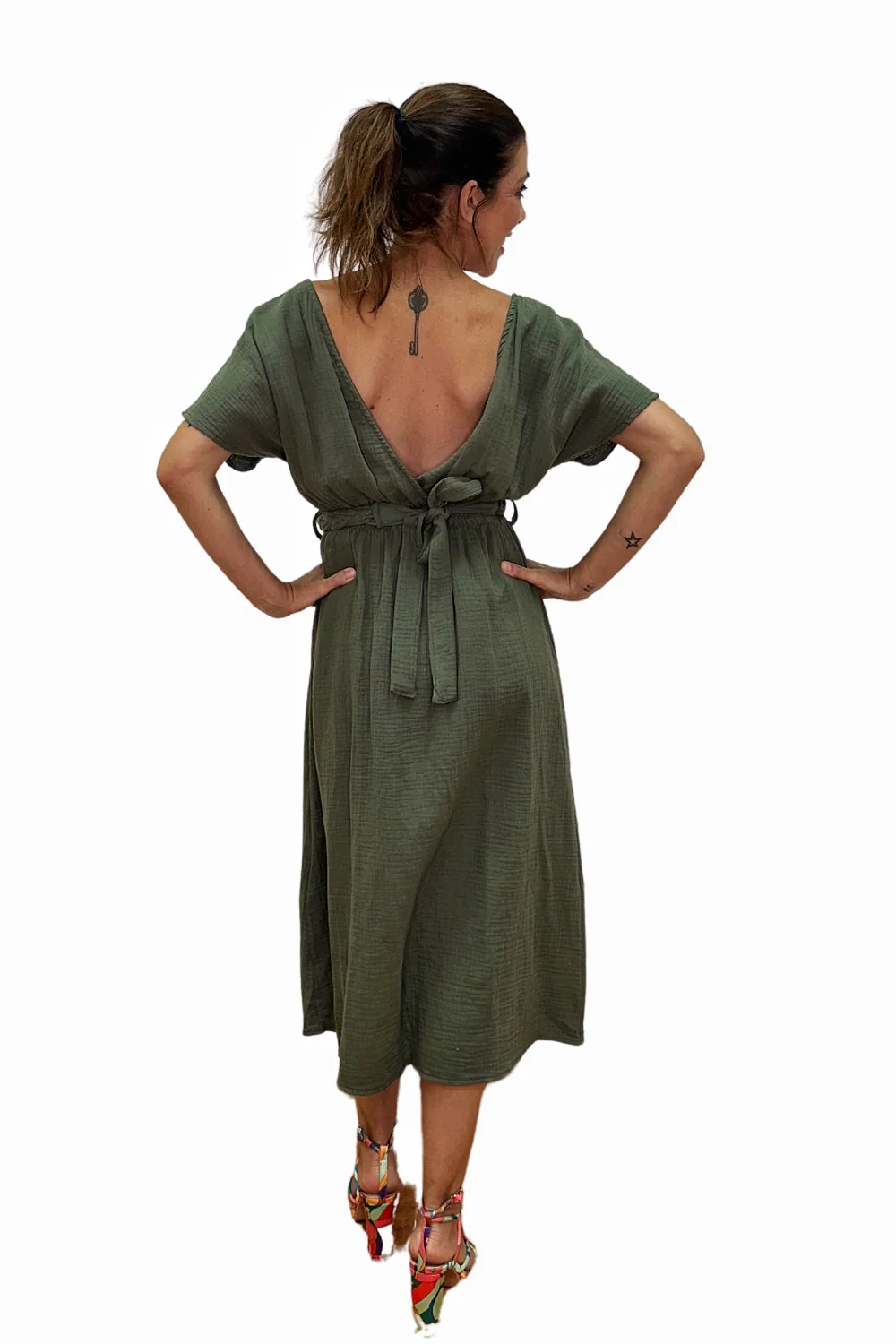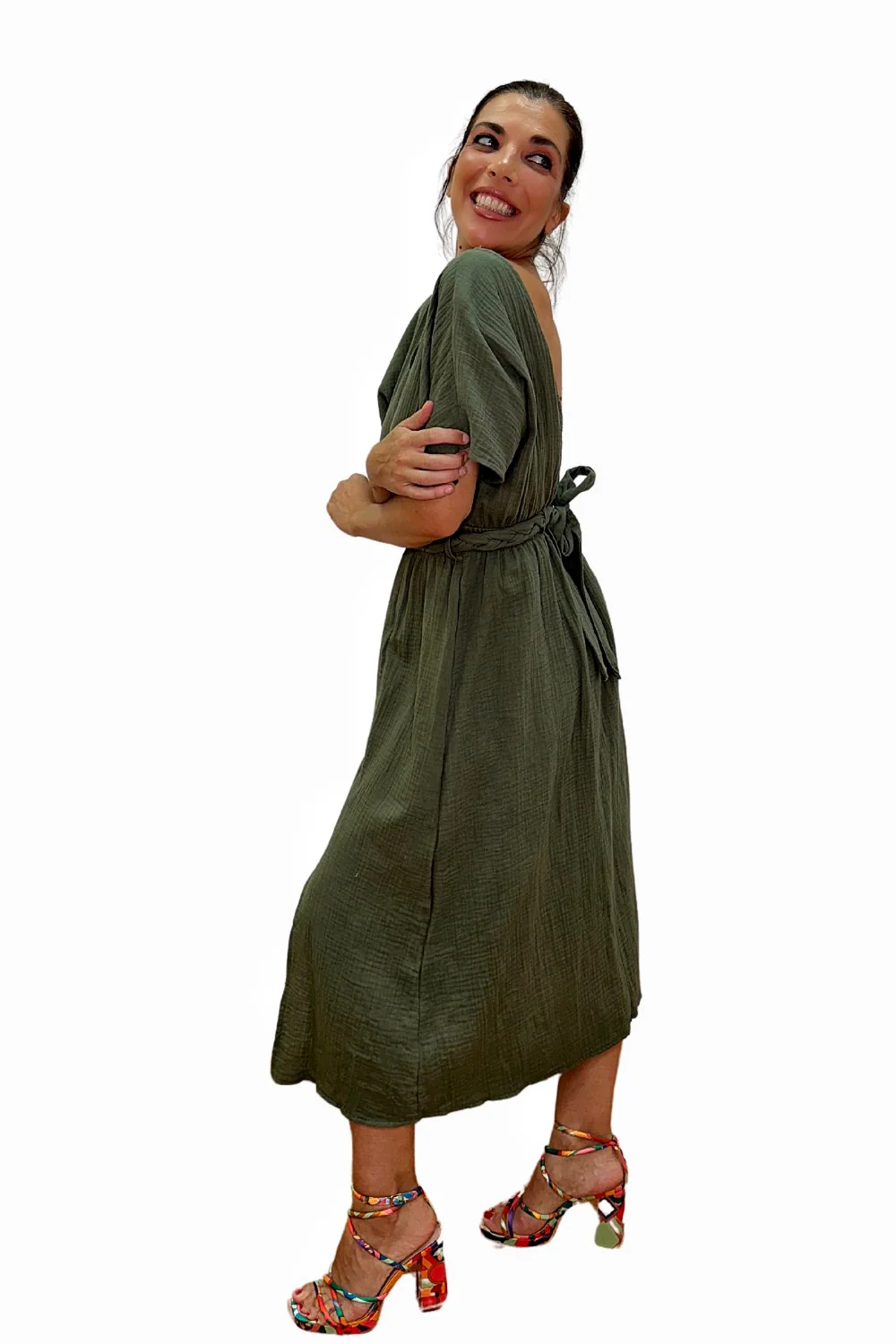Vestido midi con escote cruzado, cinturón trenzado del mismo color y espalda abierta cruzada.