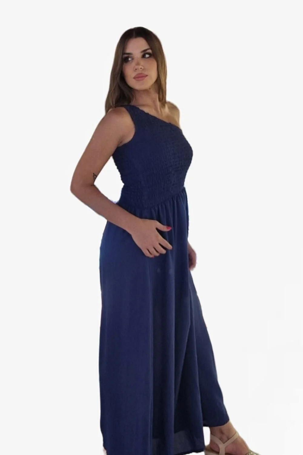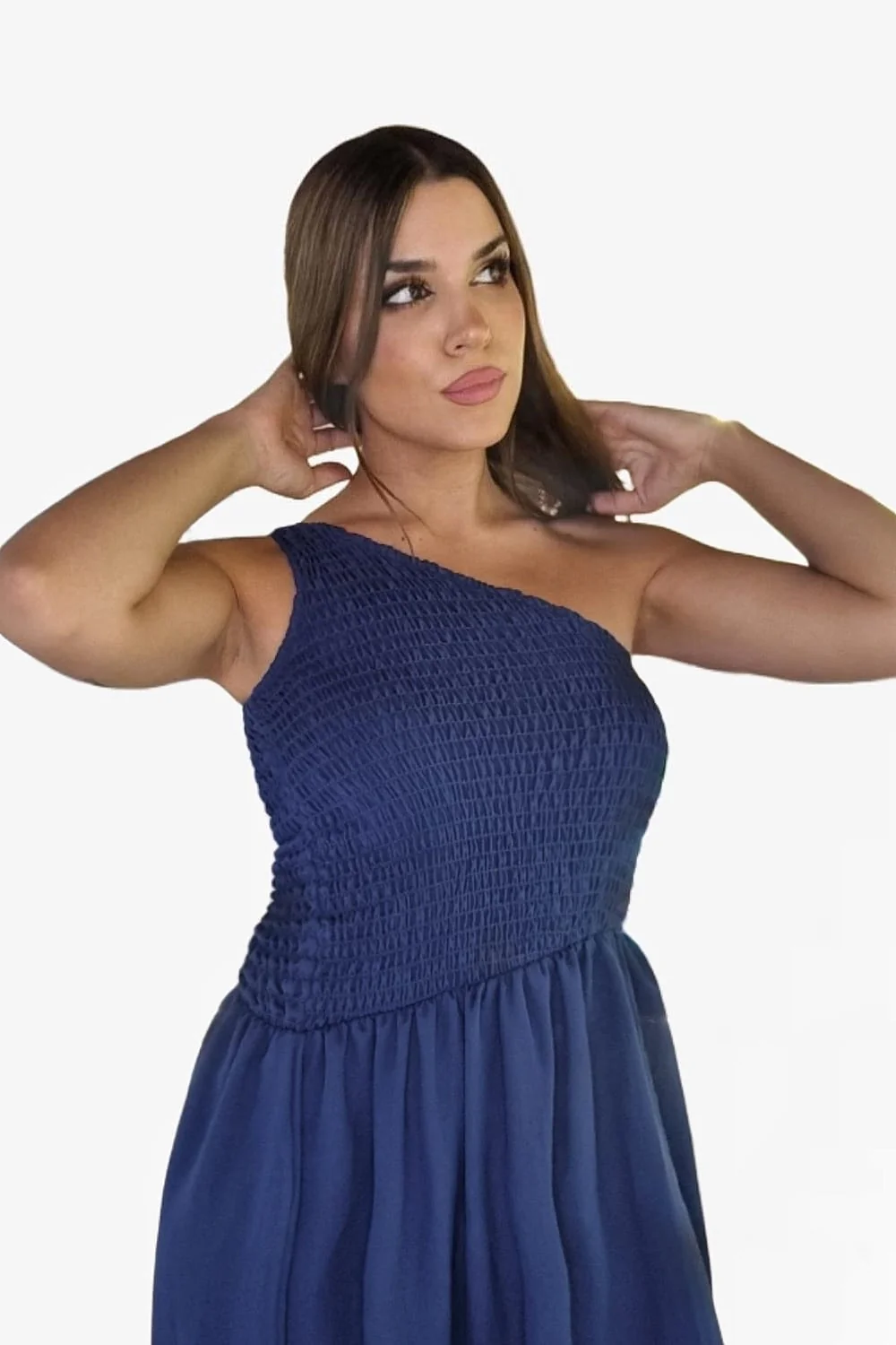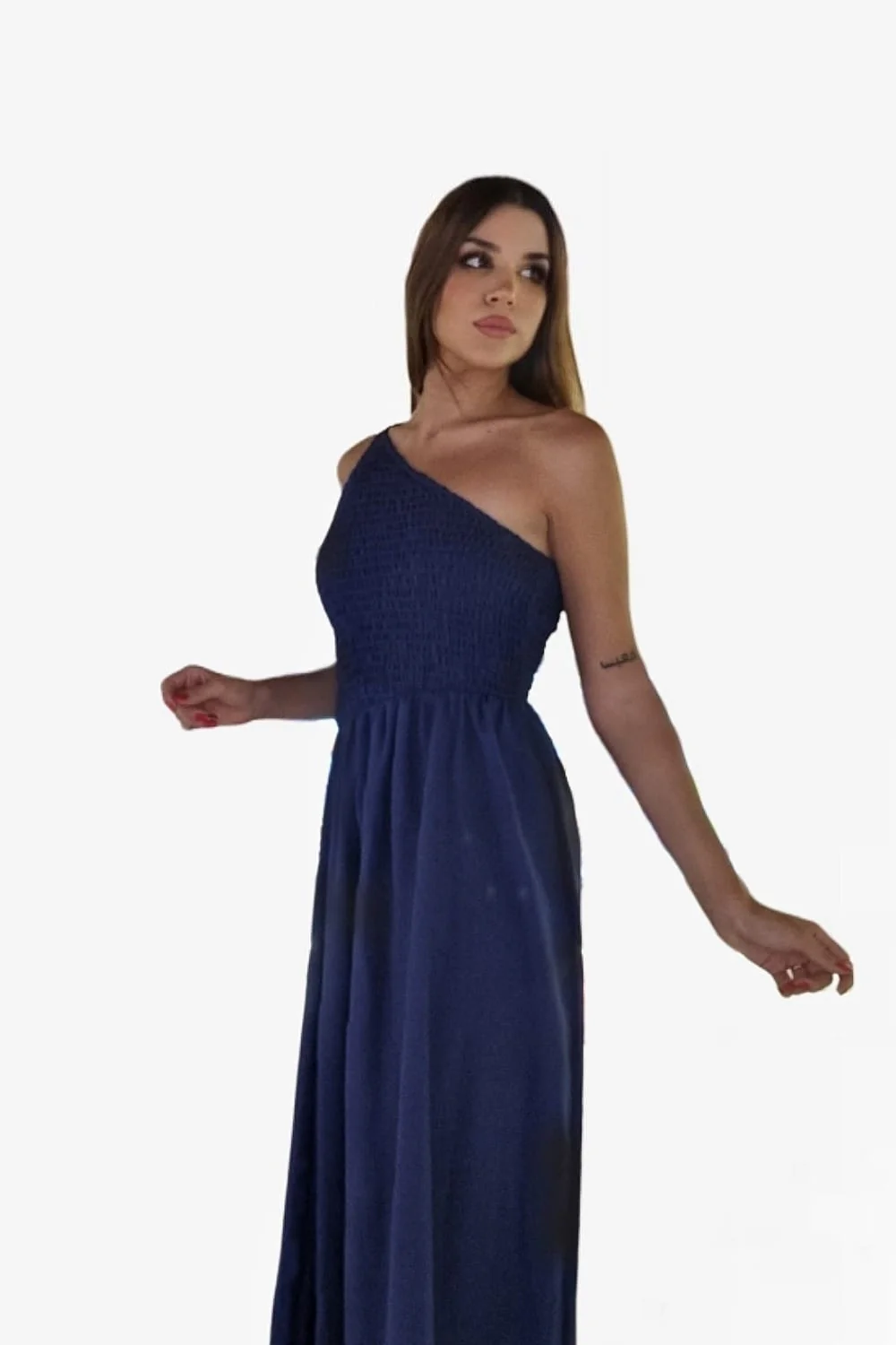 Vestido largo de un solo hombro, con cuerpo drapeado en nido de abeja.