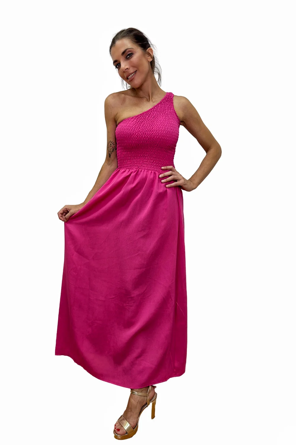Vestido largo de un solo hombro, con cuerpo drapeado en nido de abeja.