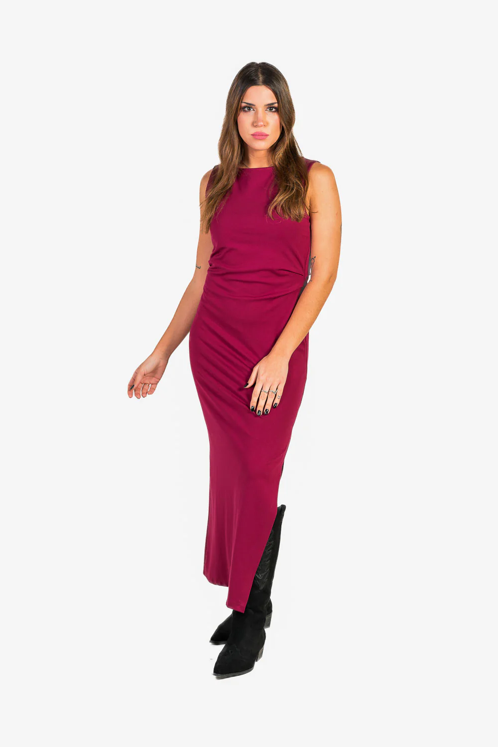 Vestido de algodón con tirante semi ancho, entallado con frunce en laterales a la altura de la cintura.