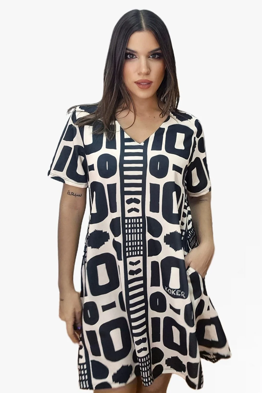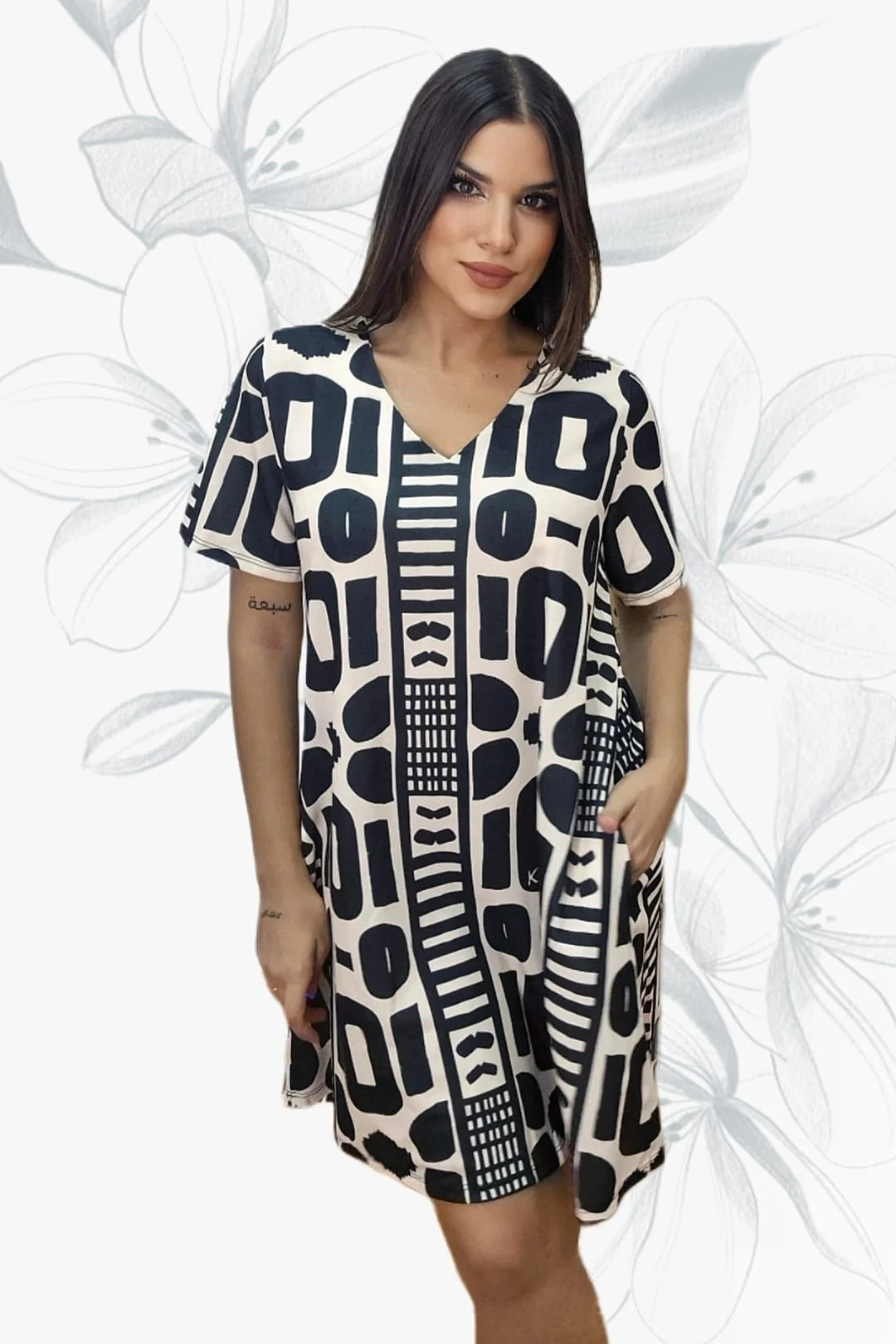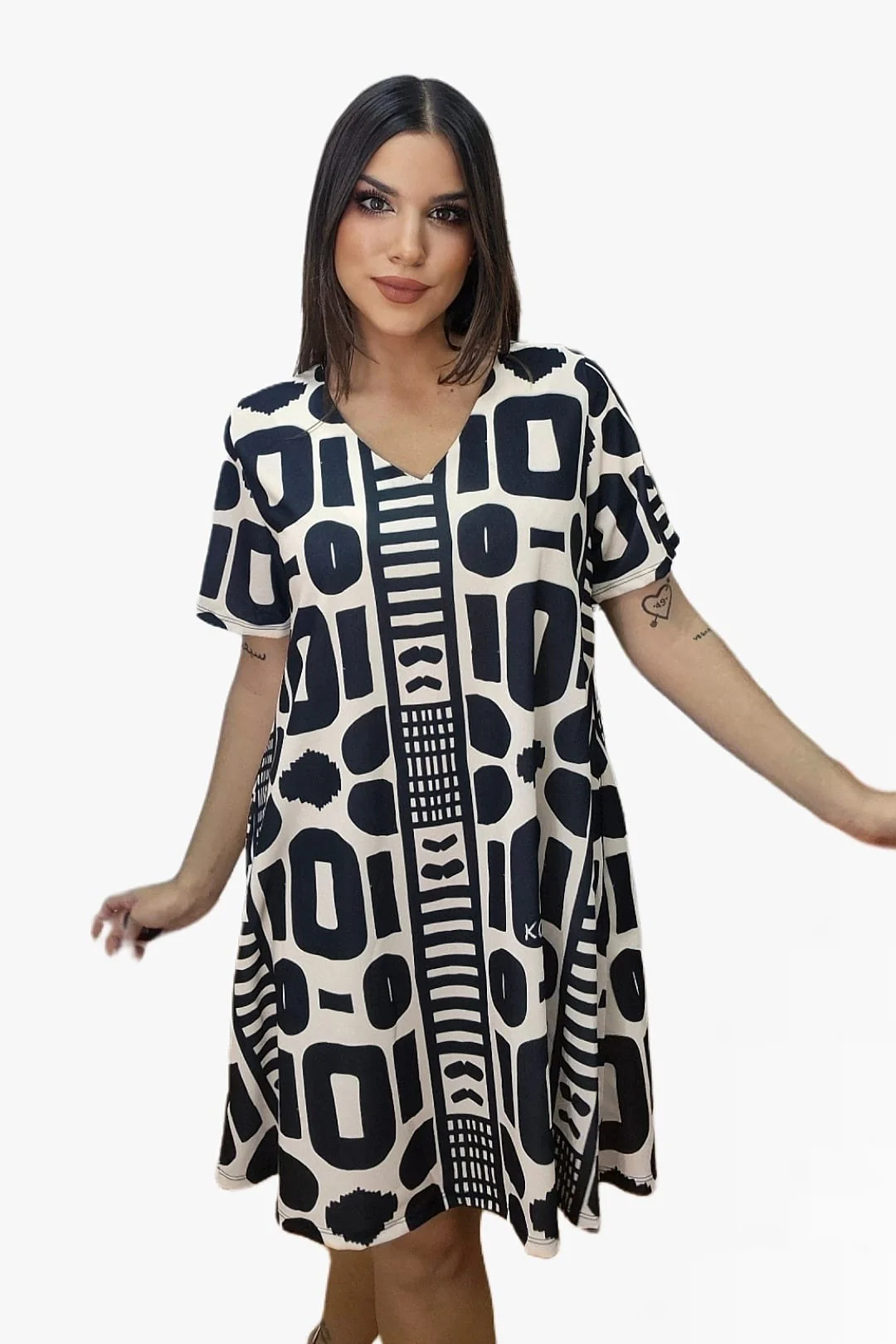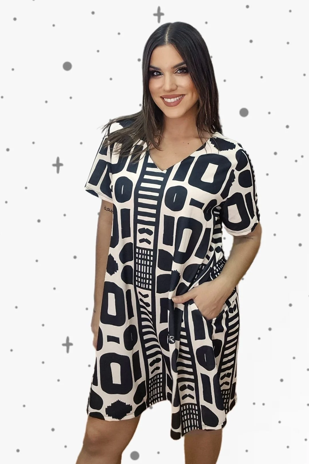 El Vestido Maya es la definición de comodidad y diseño en una sola pieza. Su estampado geométrico en blanco y negro crea un efecto visual moderno y sofisticado, mientras que su corte amplio y fluido lo convierte en la opción perfecta para cualquier ocasión.