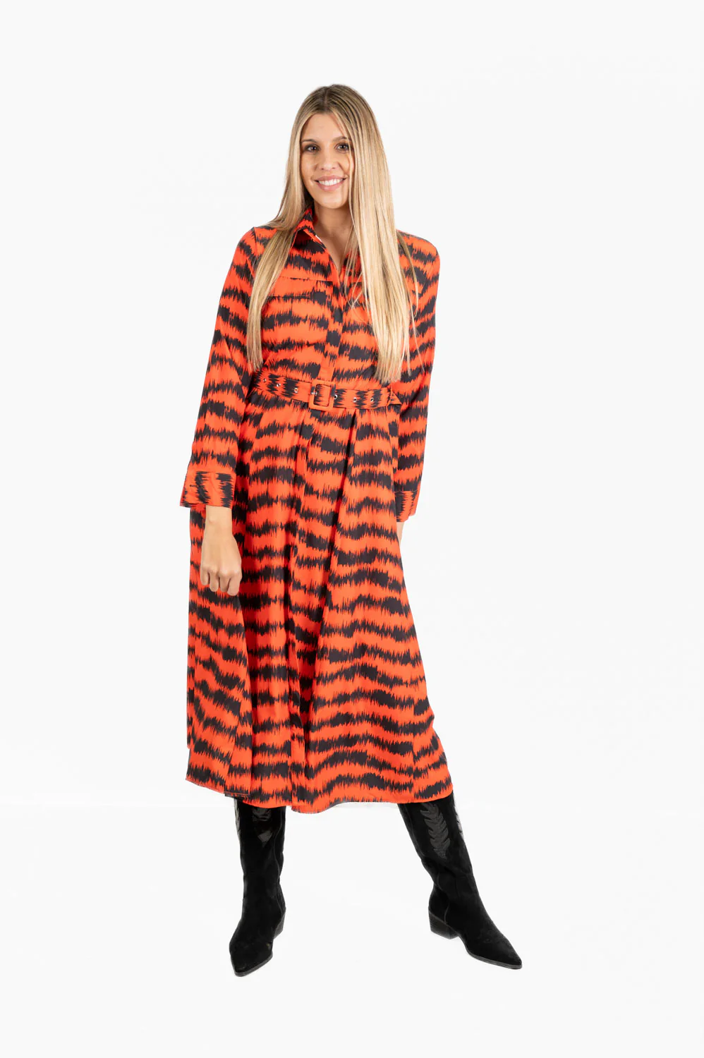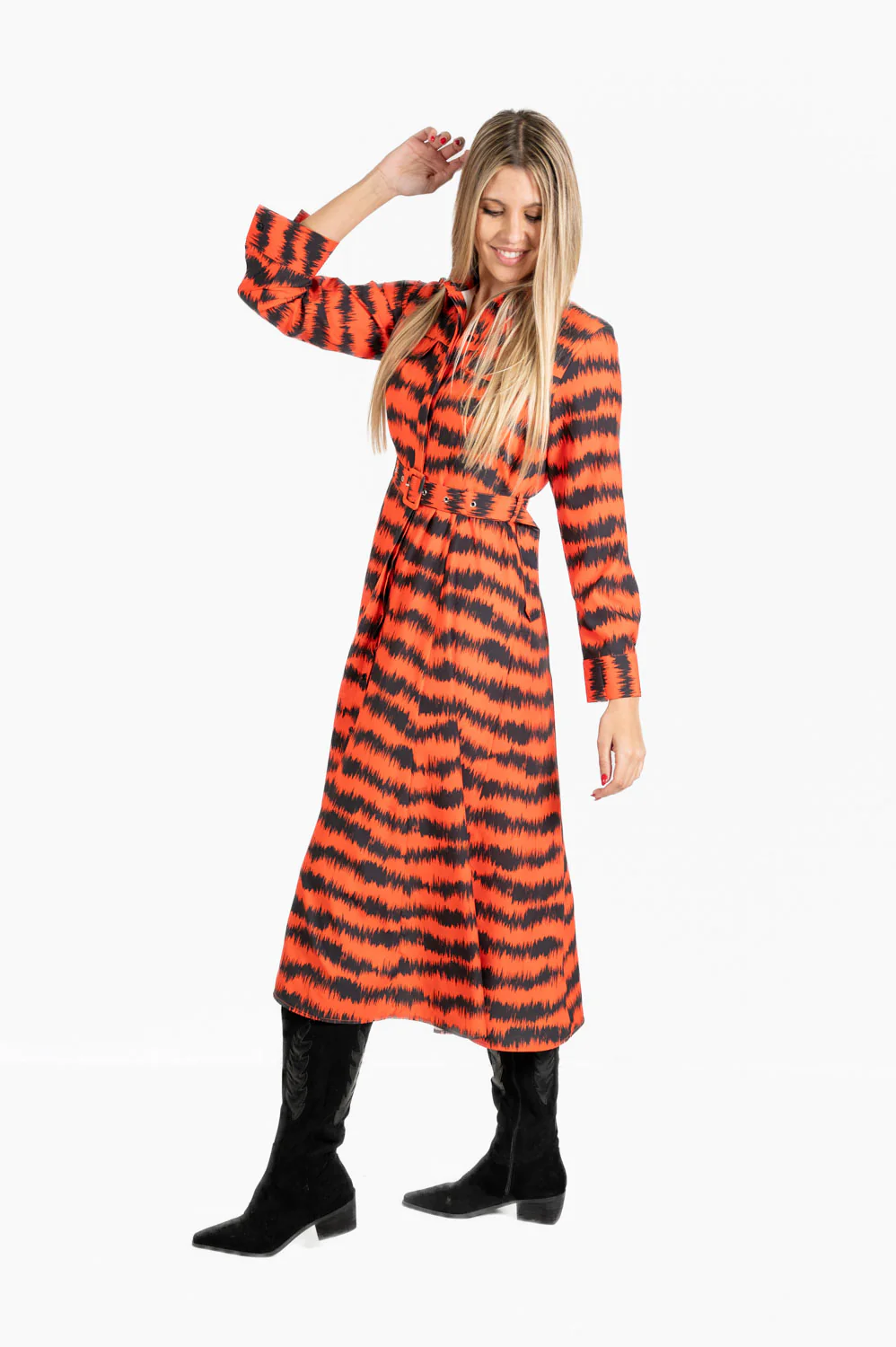 Vestido camisero con cinturón del mismo tejido a la altura de la cintura.