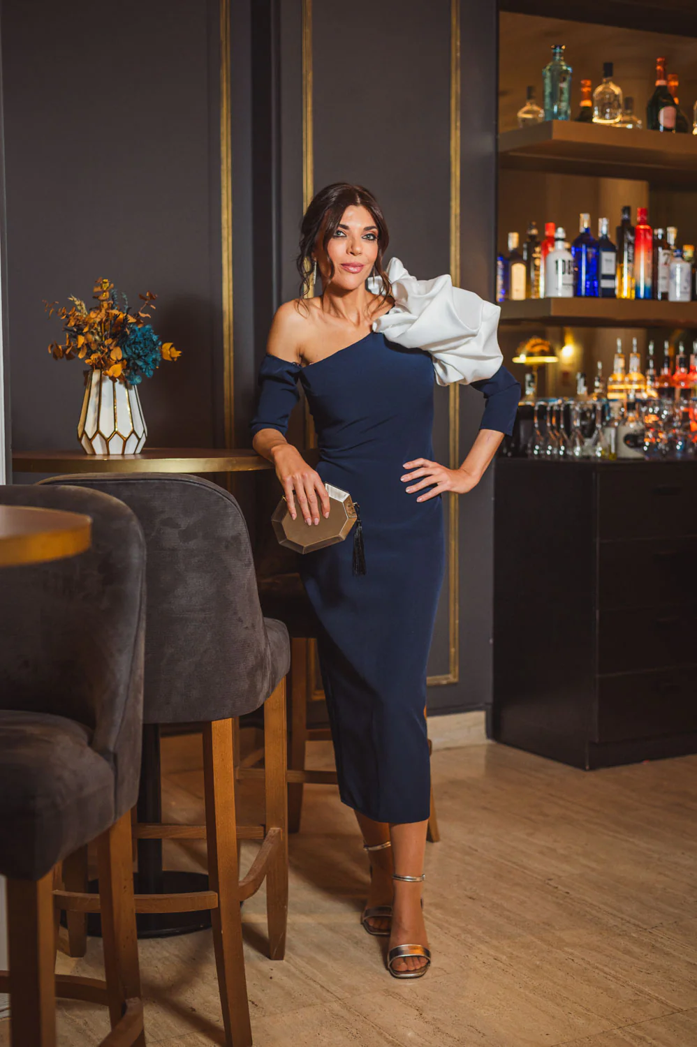 Vestido con manga caída, escote barco y corte recto, con detalle de flor en el hombro. Elegancia y comodidad en una sola prenda.