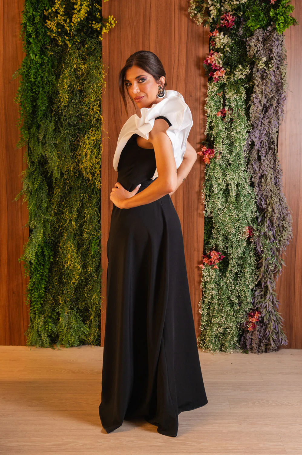 Vestido bicolor en blanco y negro. Tiene corte recto y escote barco cruzado. Este vestido es sinónimo de elegancia y sofisticación.