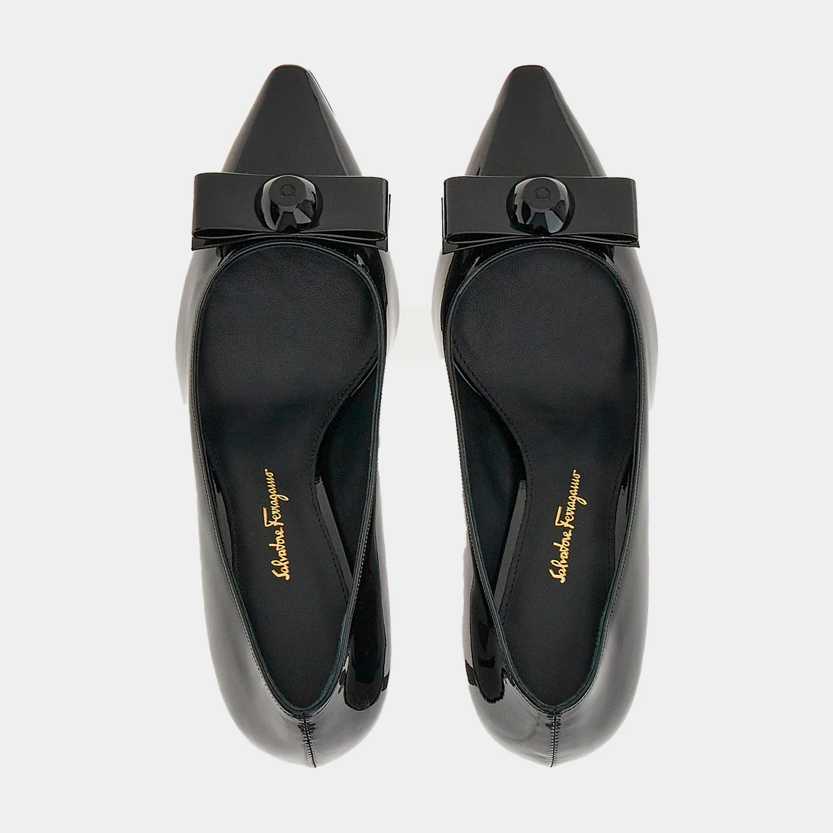 Presentan el icónico lazo Vara en la puntera, adornado con una hebilla semiesférica tonal que le otorga un acabado elegante. Cuentan con un tacón de aguja con un diseño geométrico y definido, que proporciona estabilidad y un aspecto contemporáneo. La parte superior está confeccionada en charol, y tanto la suela como la plantilla son de piel.