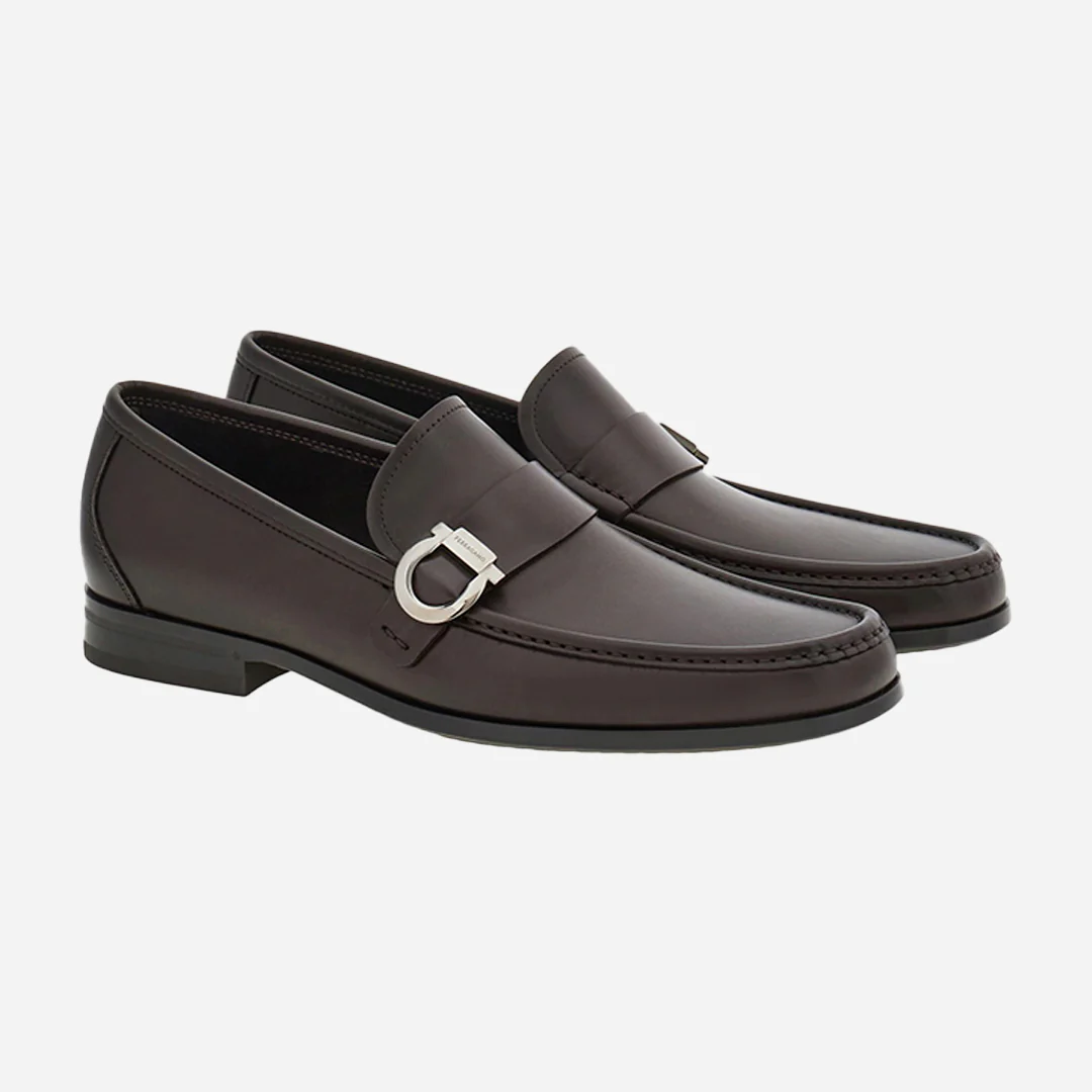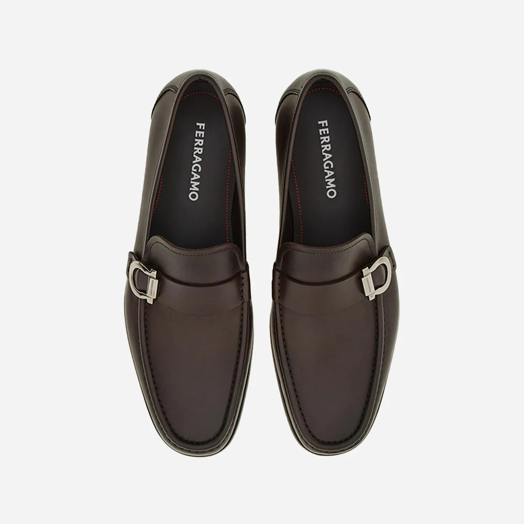 Este elegante mocasín de Salvatore Ferragamo combina artesanía italiana y diseño contemporáneo. Confeccionado en piel de becerro martillada, presenta una textura natural y un acabado artesanal que aporta una rica tonalidad bicolor. El empeine ligeramente cuadrado está adornado con un discreto detalle metálico Gancini en el lateral, símbolo icónico de la marca.