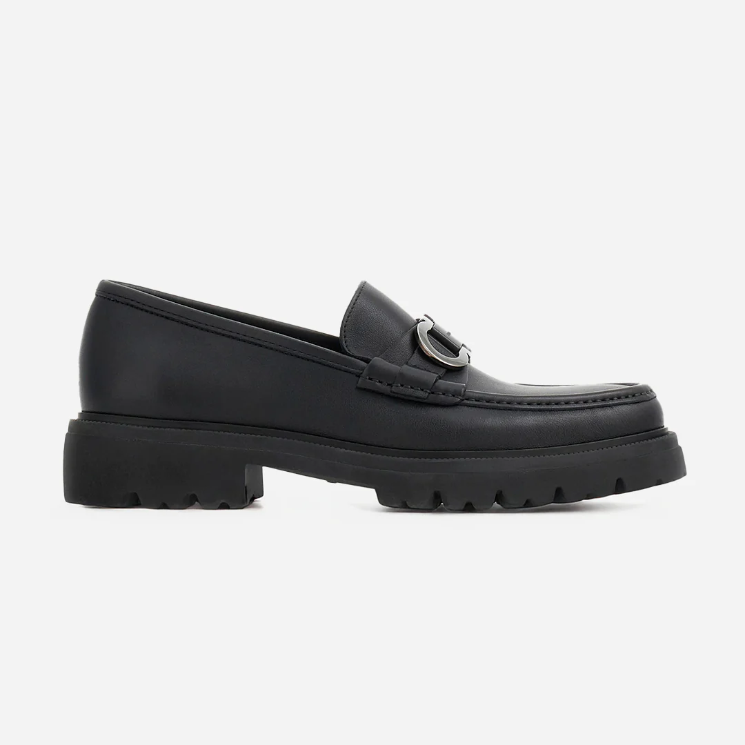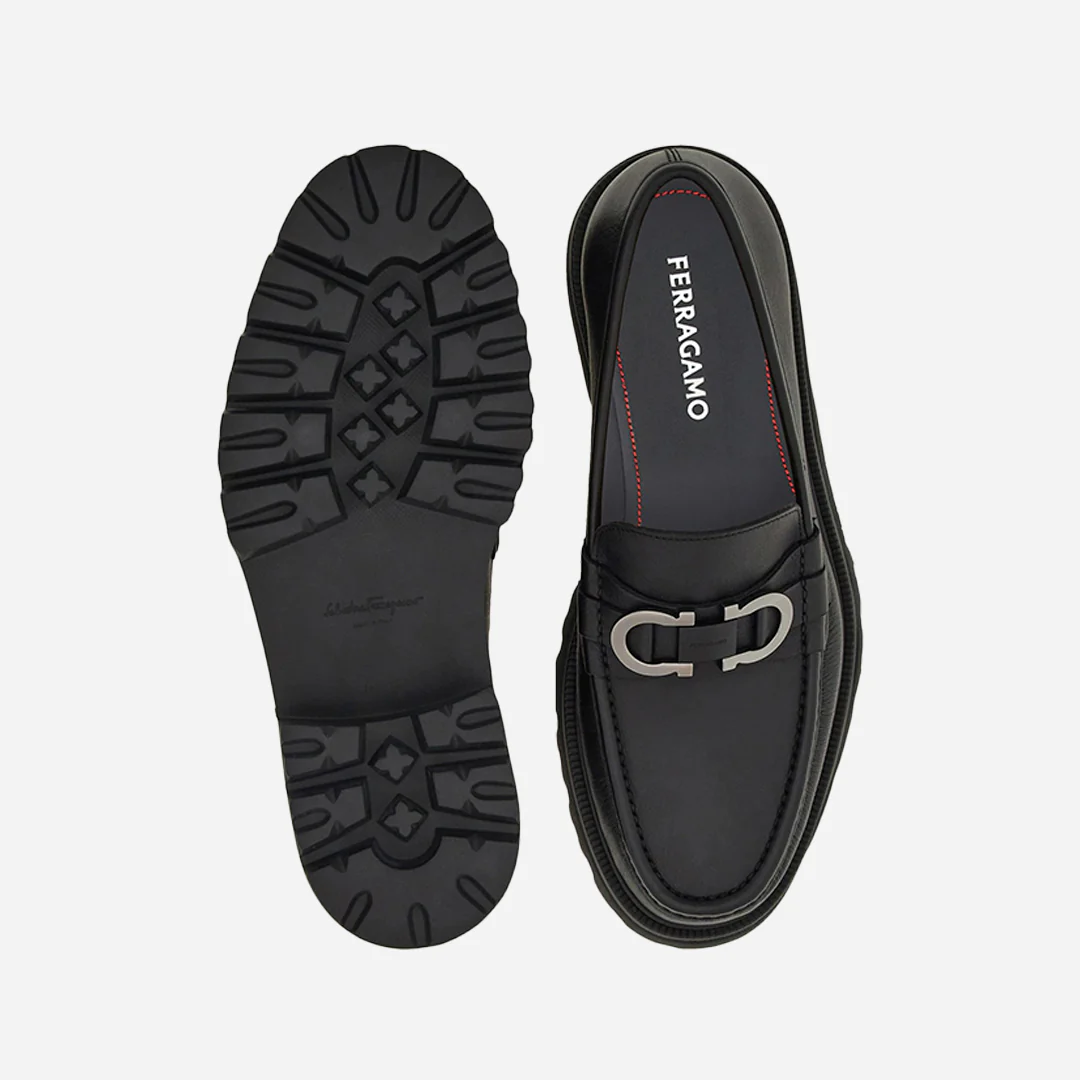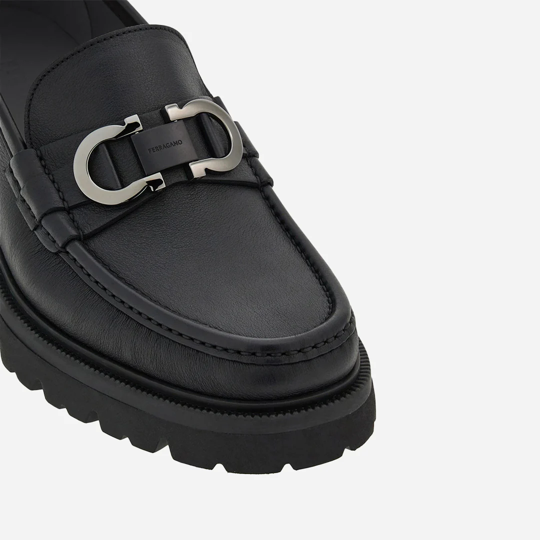 Mocasines con empeine de piel de becerro saddle, con textura rica y acabado semimate. La línea redondeada de la puntera se acentúa con la costura en relieve del Empeine, mientras que un adorno Gancini en acabado pintado decora el antifaz. Suela ultraligera de caucho, con vira adornada y piso track. Estos zapatos están confeccionados con la técnica «Tubolare», exclusiva de los zapatos de lujo: la costura manual del empeine garantiza una suavidad y una ligereza excepcionales.