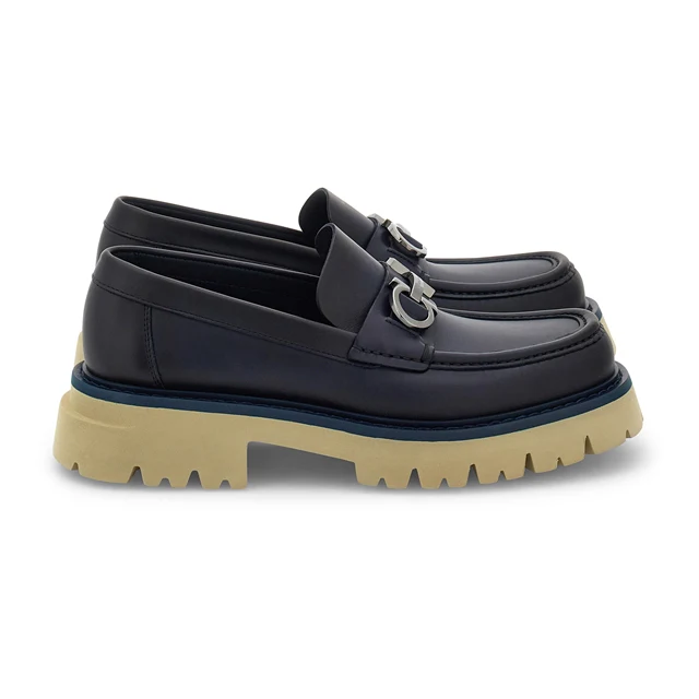 Nueva propuesta de piel de becerro de textura natural para los mocasines de construcción informal, con punta ligeramente cuadrada y pespunteada con cordoncillo de piel en el Empeine. El modelo está elaborado en piel de becerro y gamuza en color azul marino con adornado con el estribo con Gancini laterales, icónicos de la marca italiana de Salvatore Ferragamo, en acabado titanio para una nota metropolitana, mientras que la suela blanca de goma evoca los diseños de los zapatos náuticos.En ocasiones, el color en las fotografías puede diferir un poco del producto real debido a la iluminación y otros aspectos técnicos.