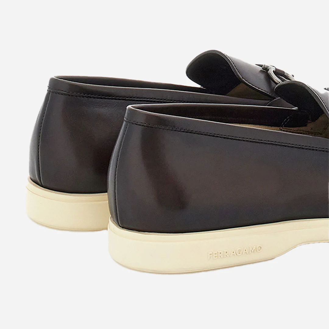 Nueva propuesta de piel de becerro de textura natural para los mocasines de construcción informal, con punta ligeramente cuadrada y pespunteada con cordoncillo de piel en el Empeine. El modelo está adornado con el estribo con Gancini laterales, icónicos de la marca italiana de Salvatore Ferragamo, en acabado titanio para una nota metropolitana, mientras que la suela blanca de goma evoca los diseños de los zapatos náuticos.