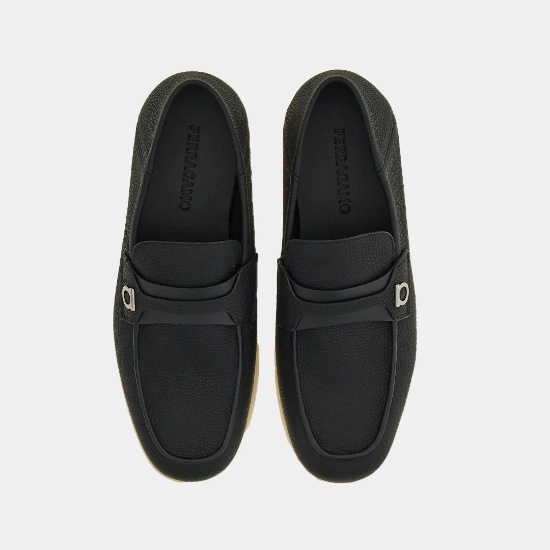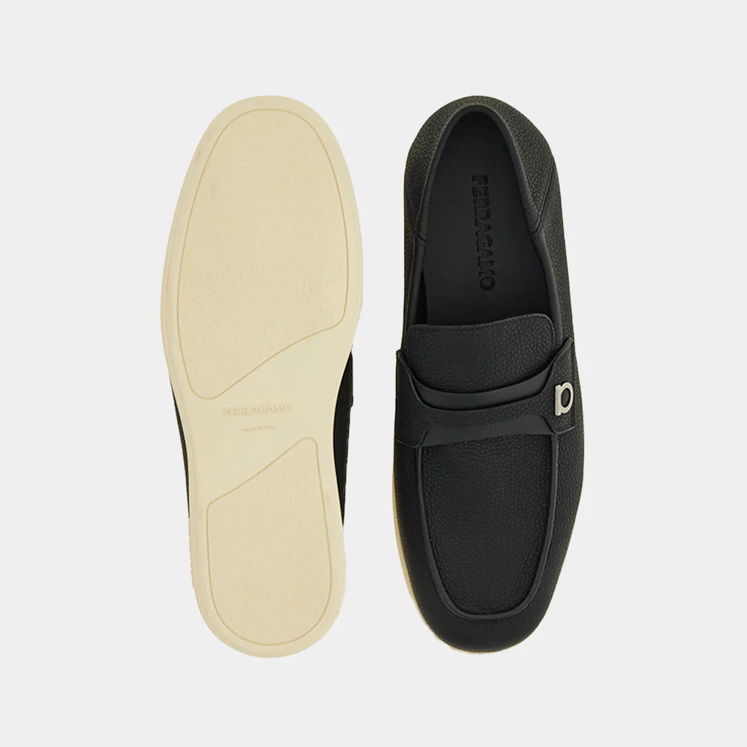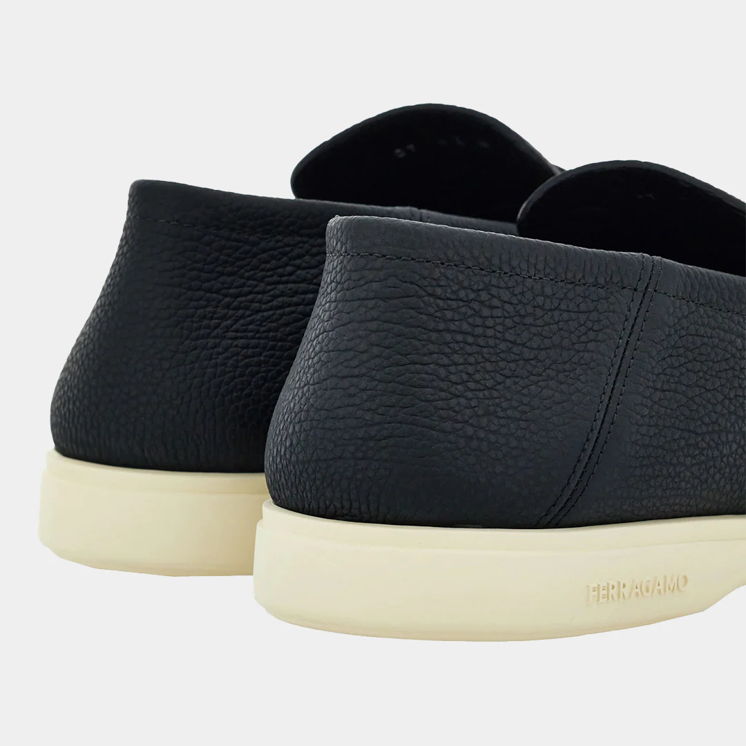 Mocasines desestructurados de aire veraniega, en color Negro con empeine en suave ante de becerro. La punta almendrada está adornada con un Empeine pespunteado, con cordoncillo con acabado en vivo para un toque aún más informal. La doble banda transversal tiene un pequeño adorno Gancini lateral con acabado titanio. Suela flexible de goma blanca.