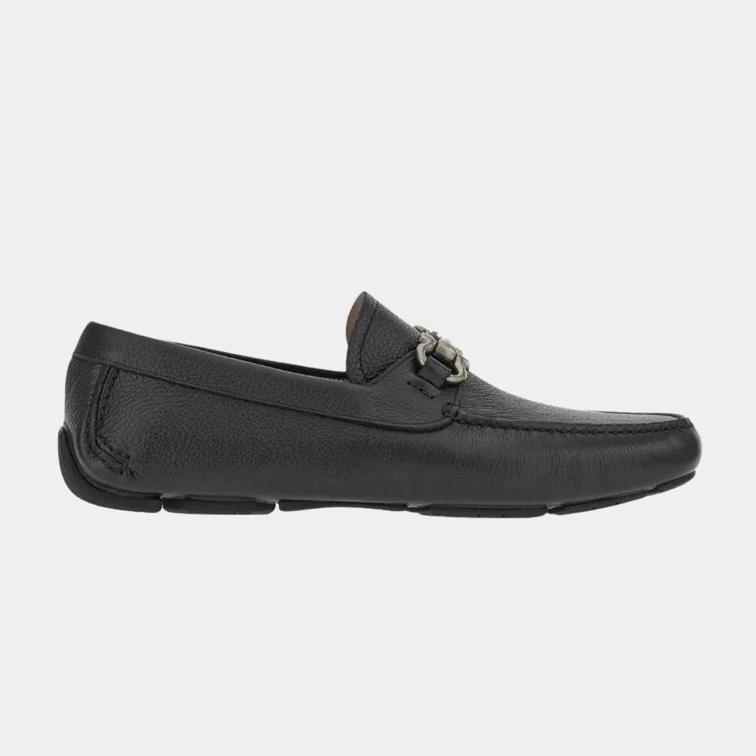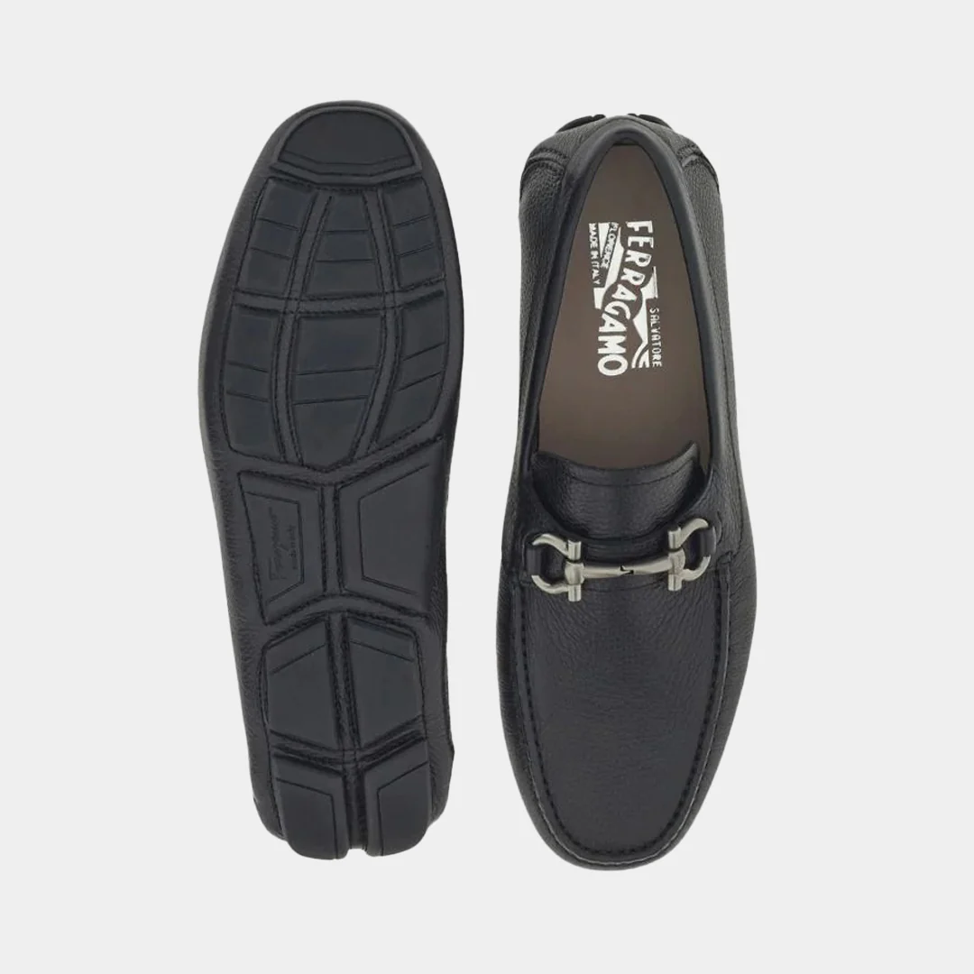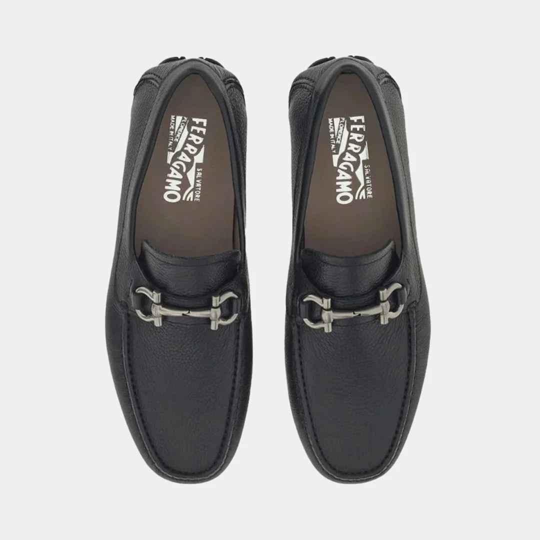 Elegantes mocasines driver con empeine de piel de becerro abatanada. Decorados con un estribo Gancini en metal iridiscente y suela de goma personalizada, son el modelo ideal para looks informales o para el tiempo libre. La construcción «Tubolare» garantiza una suavidad y una ligereza excepcionales. Empeine cosido a mano, técnica tradicional exclusiva de los zapatos de lujo.
