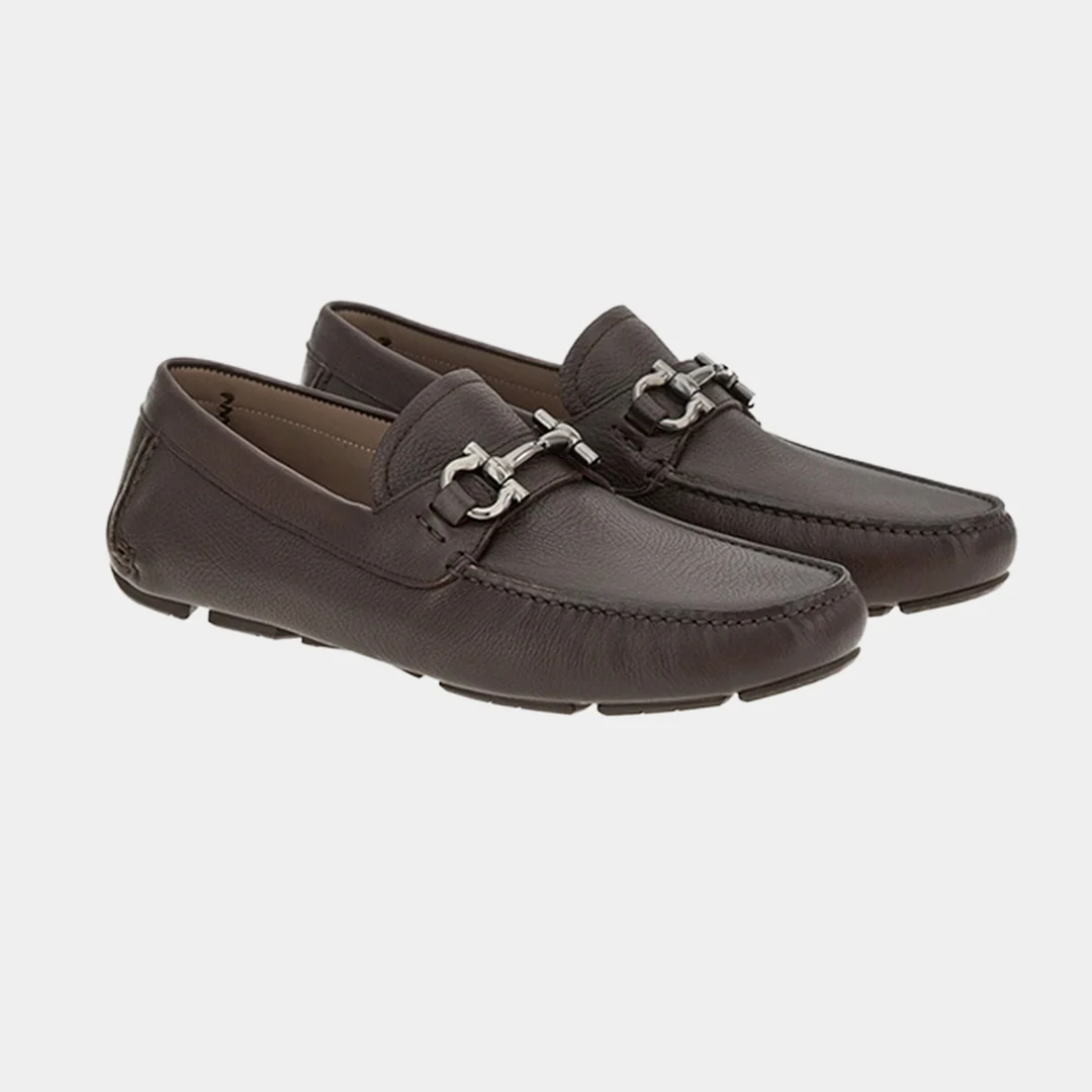 Estos mocasines driver de Salvatore Ferragamo combinan elegancia y confort en un diseño sofisticado. Confeccionados en piel de becerro martillada, presentan un empeine cosido a mano y un adorno Gancini en metal iridiscente que aporta un toque distintivo. La construcción «Tubolare» garantiza una suavidad y ligereza excepcionales, mientras que la suela de goma personalizada ofrece flexibilidad y tracción.