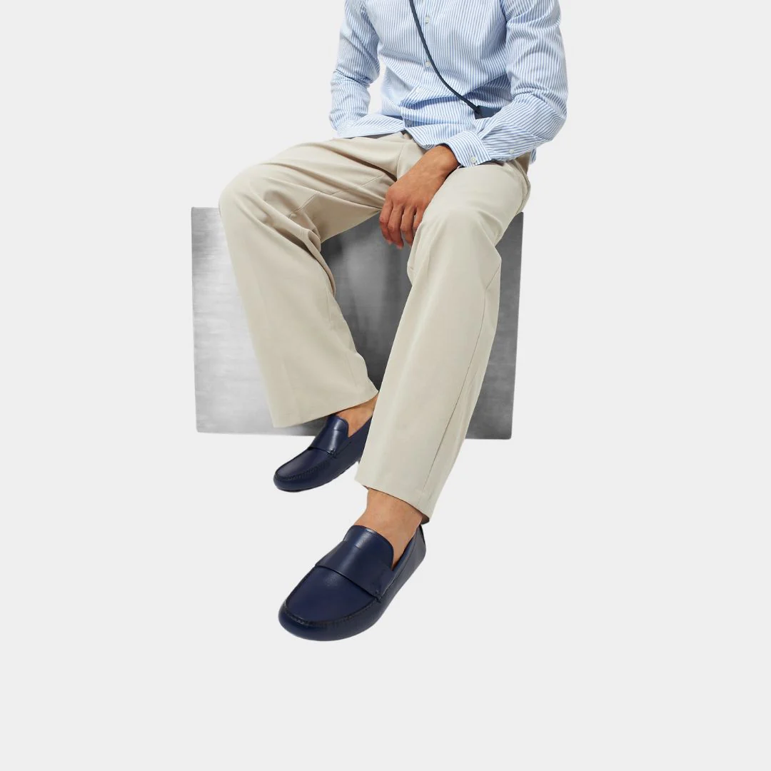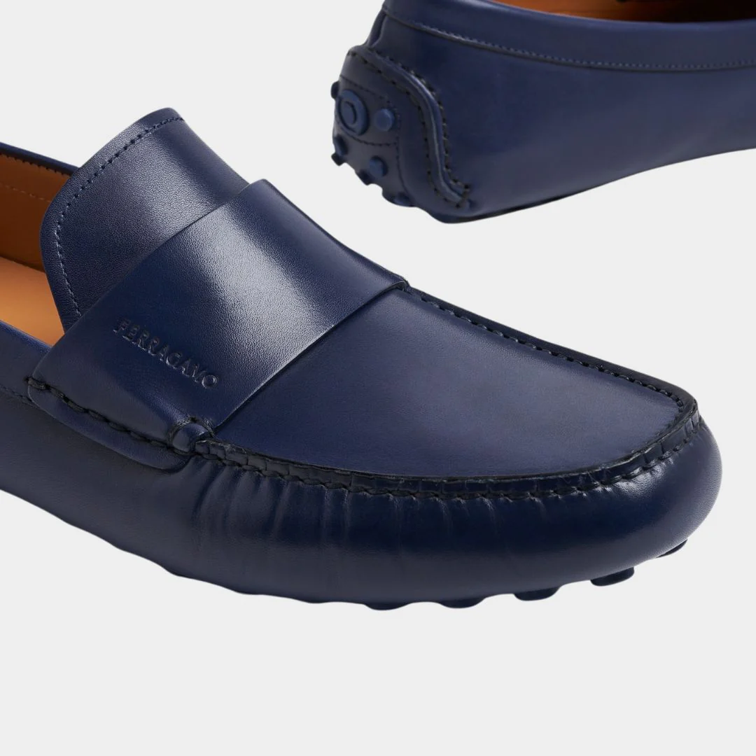 Los zapatos mocasines para hombre driver giulito color azul marino del diseñador Salvatore Ferragamo, son caracterizados por su suela flexible y con pequeños tacos de goma para un mejor agarre y comodidad al conducir. Presentan una banda transversal sobre el empeine y costuras visibles que definen su estructura, un diseño clásico y sofisticado. Están confeccionados en piel de becerro (calfskin), lo que indica un material de alta calidad y durabilidad. El color predominante es azul marino.