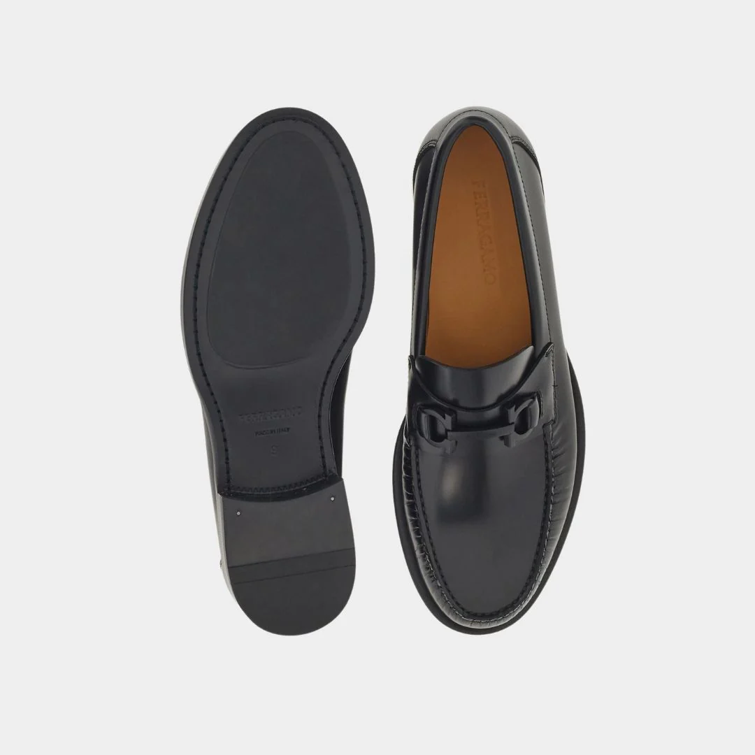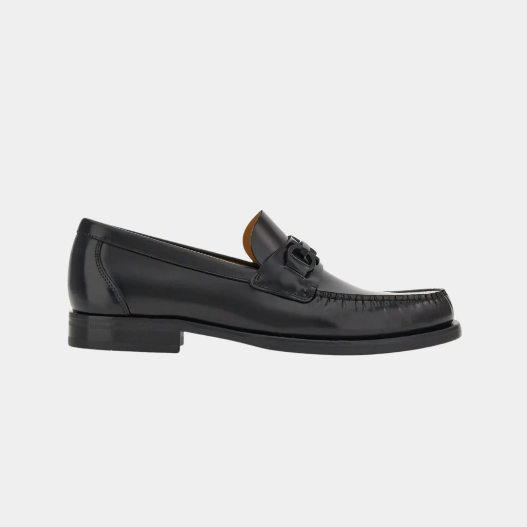 Los zapatos mocasines Fort gancini para hombre en color negro del diseñador Salvatore Ferragamo, tienen una forma clásica de mocasín con punta redondeada y una banda transversal con el icónico adorno Gancini metálico en el empeine, que les confiere un toque distintivo.