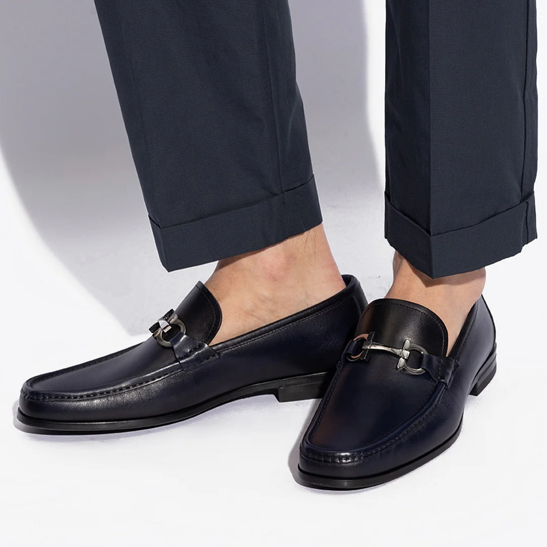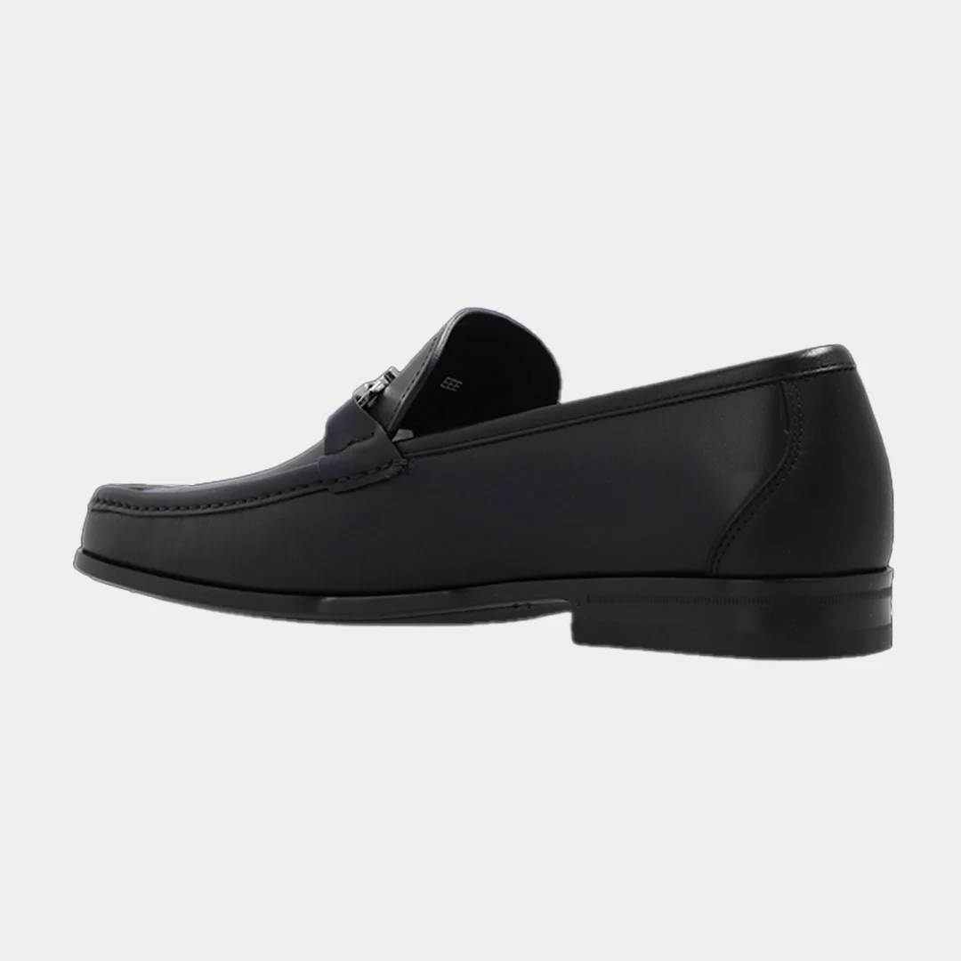 El Zapato Mocasines Grandioso en color Azul Oscuro del diseñador Salvatore Ferragamo. Presentan una silueta clásica y elegante, con una construcción tubular. Están elaborados en cuero de alta calidad. Incluyen el icónico adorno metálico Gancini, cuentan con una plantilla ligeramente acolchada para mayor confort y una suela duradera.