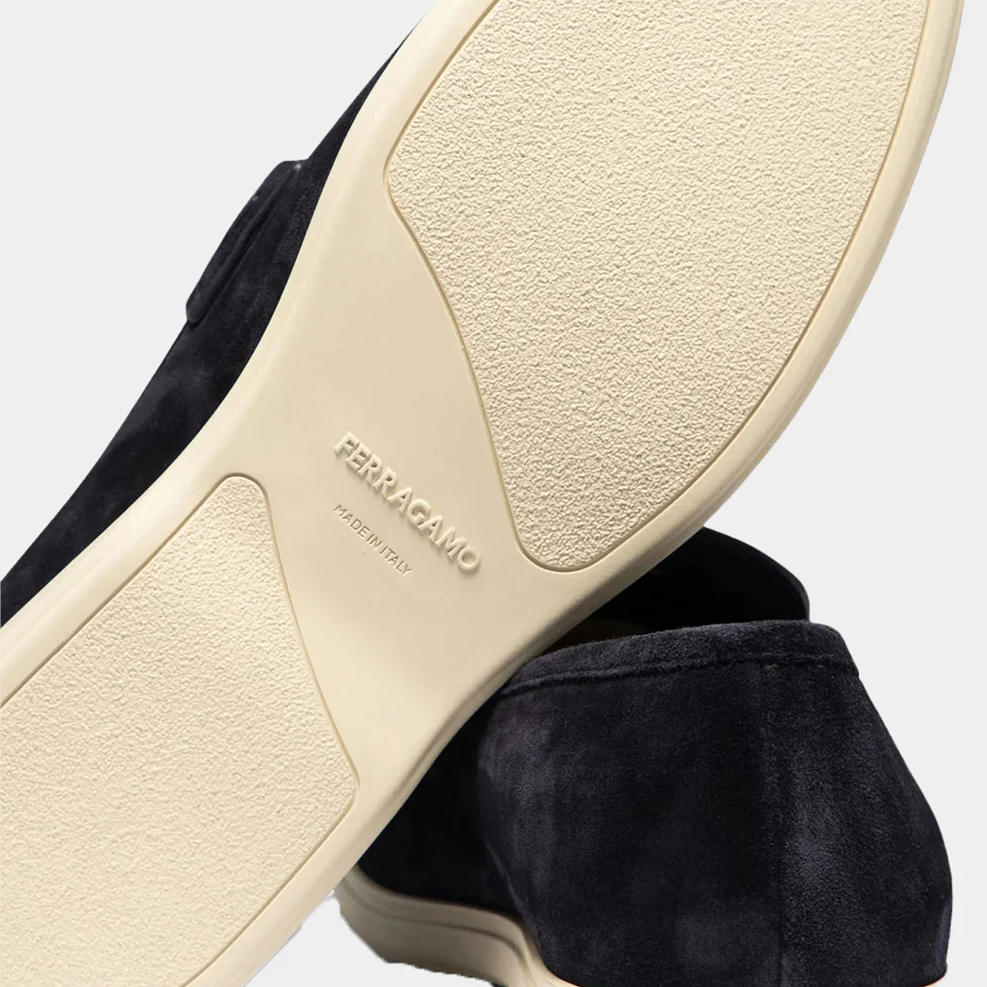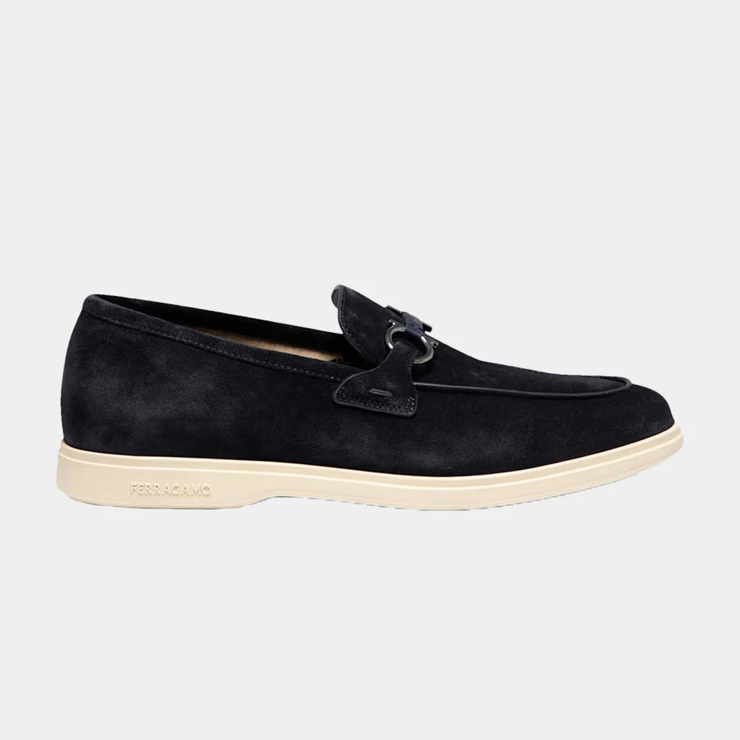 Nueva propuesta en ante para los mocasines de construcción informal, con punta ligeramente cuadrada y pespunteada con cordoncillo de piel en el plastrón. El modelo está adornado con el estribo con Gancini laterales en acabado titanio para una nota metropolitana, mientras que la suela blanca de goma evoca los diseños de los zapatos náuticos.