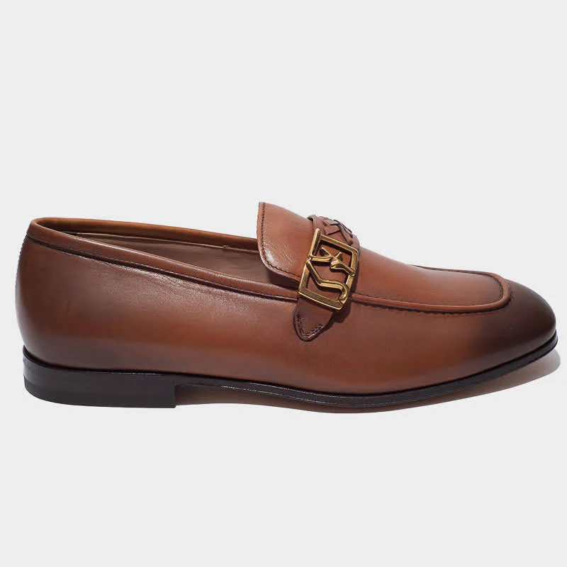 Mocasines de piel en tono marrón que combinan sofisticación clásica con un toque distintivo. Confeccionados en cuero de alta calidad, destacan por su textura suave y acabado impecable. El detalle trenzado en el empeine, acompañado de una placa metálica dorada con el icónico logo, aporta un aire refinado y contemporáneo. Una suela flexible y construcción artesanal aseguran confort y durabilidad, convirtiéndolos en la elección perfecta para un estilo elegante y versátil.