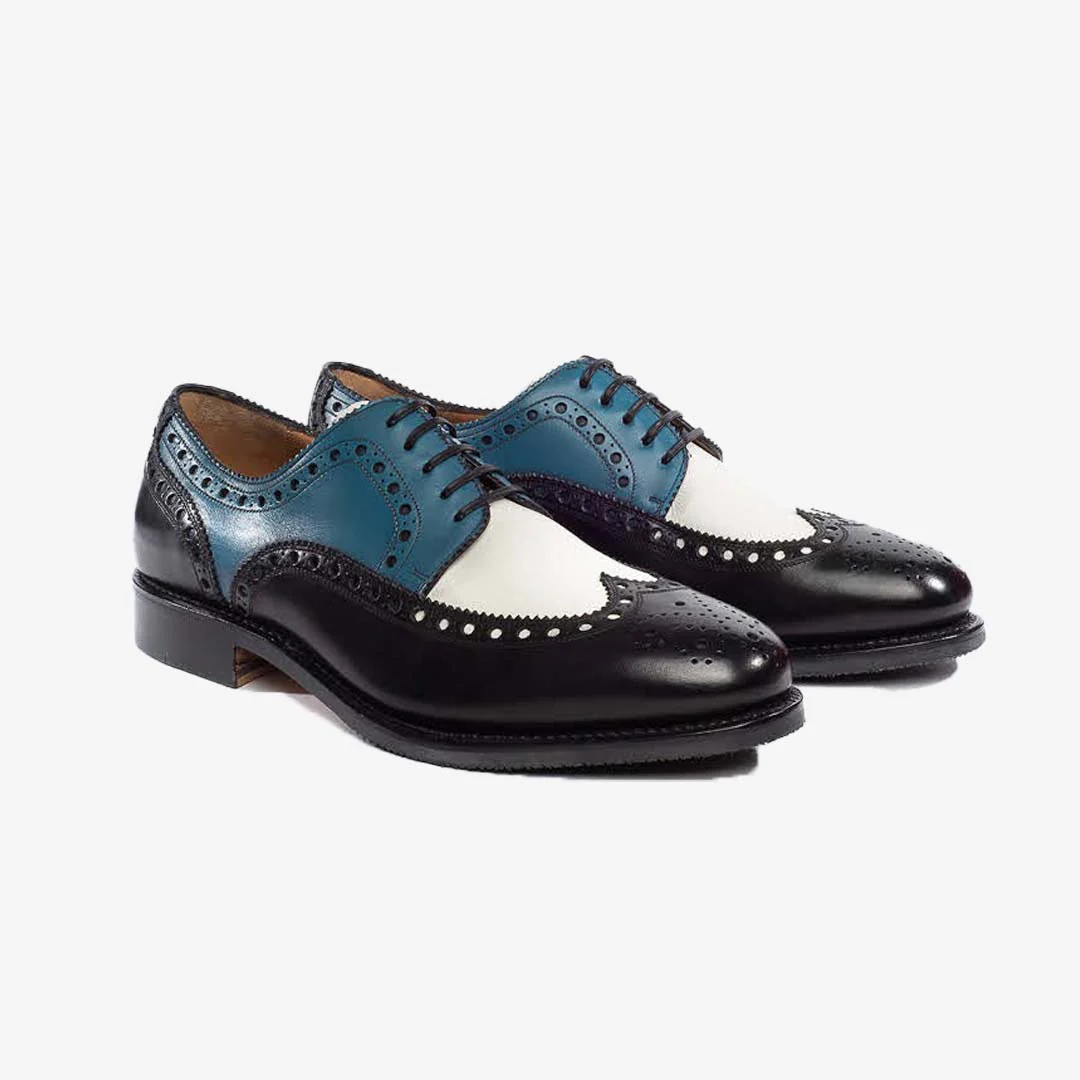 Este zapato tipo Oxford brogue tricolor destaca por su original combinación de colores: negro profundo en la punta y el talón, blanco en el empeine, y un elegante azul petróleo en la parte superior. Fabricado en cuero de alta calidad, presenta detalles perforados tradicionales (wingtip) que acentúan su estilo clásico inglés. Su suela de cuero y su construcción sólida lo convierten en una pieza ideal para quienes buscan sofisticación con un giro moderno. Perfecto para eventos formales o para añadir personalidad a un outfit elegante.