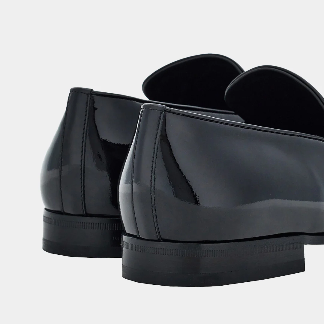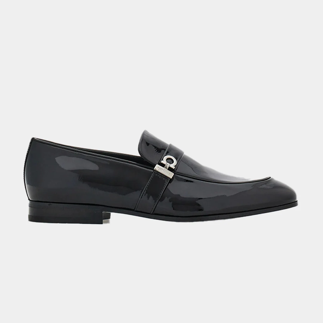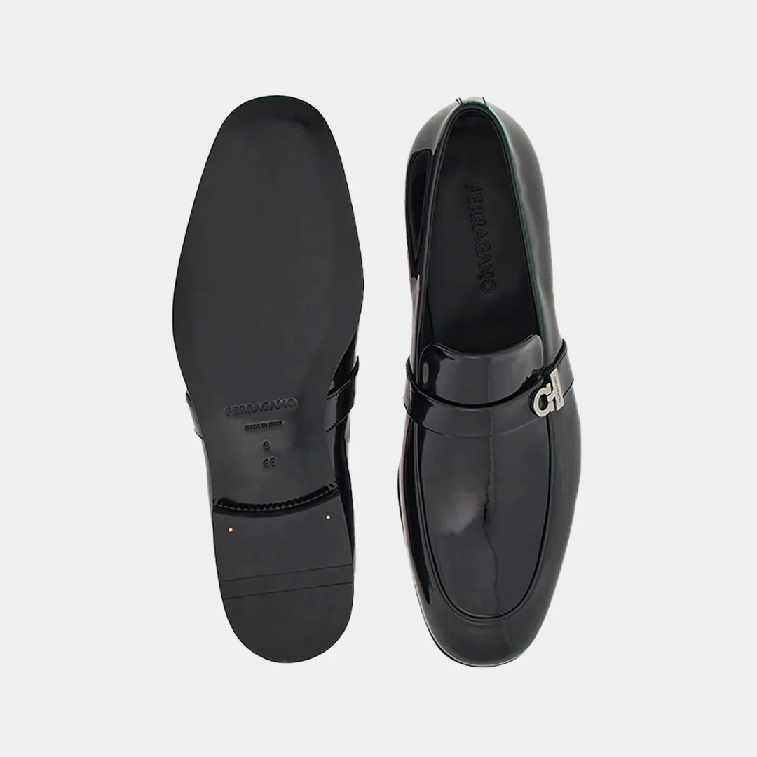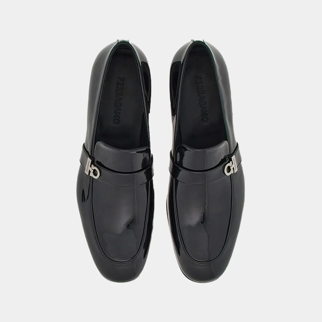 Zapato Mocasines en color negro con la caracteristica hebilla gancini en Cuero Brillante del diseñador Salvatore Ferragamo Confeccionados en charol de piel de becerro. Presentan una puntera de almendra y una suela apilada. Cuentan con una plantilla de cuero con la marca, forro de cuero y el distintivo detalle de la placa Gancini, un código icónico de la casa inspirado en la puerta de hierro forjado del Palazzo Spini Feron. Siendo una opción casual pero sofisticada, ideal para escapadas de fin de semana.