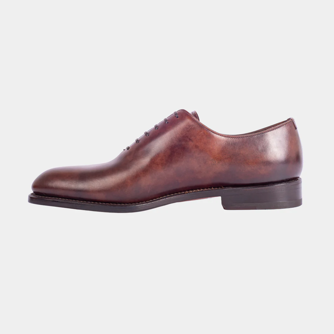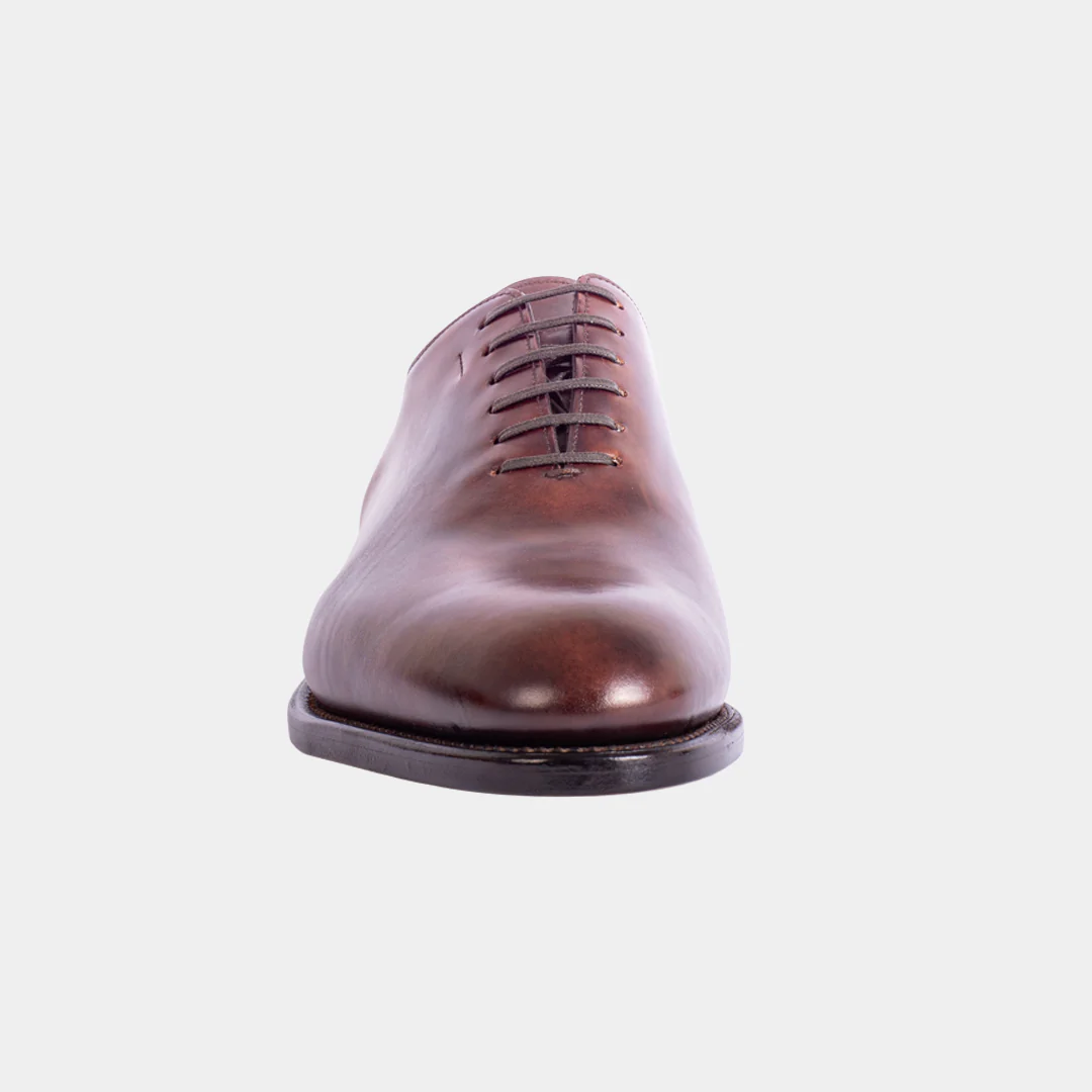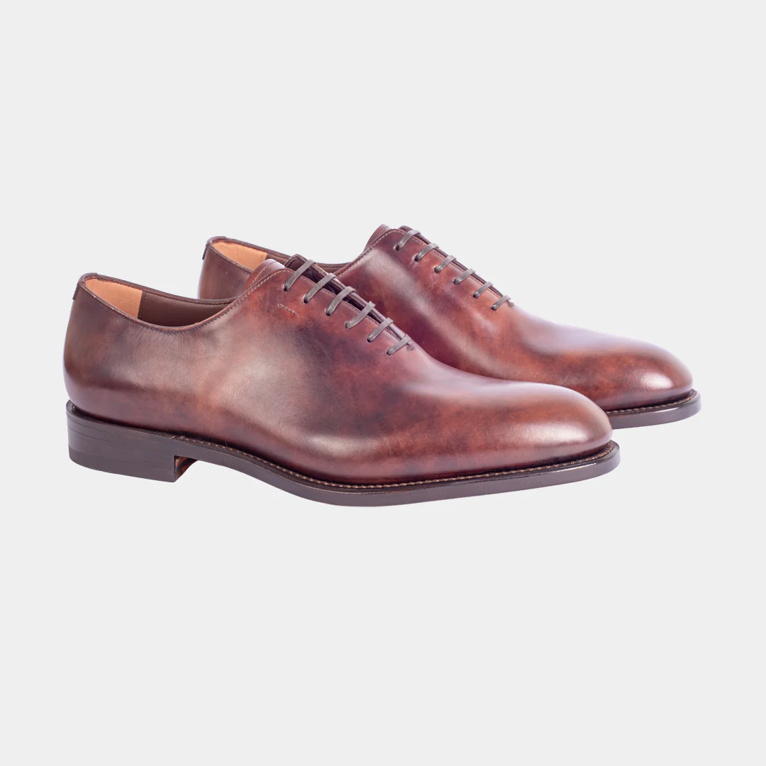 Diseño esencial y look clásico para los zapatos Oxford en piel de becerro de acabado semi brillante tamponada de forma artesanal, para una especial profundidad cromática. La forma almendrada se ha renovado para dar más ergonomía y comodidad. La suela de cuero tiene un acabado envejecido y está acabada manualmente. La construcción llamada «Tramezza» es sinónimo de artesanía y excelencia. El proceso incluye unas 160 fases distintas y más de 6 horas de trabajo manual de un zapatero experto, a fin de combinar robusteza y resistencia con flexibilidad y comodidad absoluta.